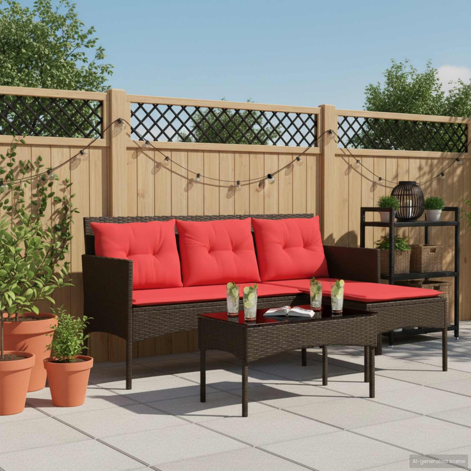 Ta moderni vrtni sedežni set je narejen za preobrazbo udobja in stila v vašem zunanjem prostoru. Elegantne linije in minimalistični pristop enostavno spremenijo vsak vrt ali teraso v prijetno zavetje. Odličen za druženja ali sproščanje, njegova L-oblikovana zasnova je vsestranska izbira, ki se prilega različnim zunanjim stilom. Mešanica funkcionalnosti in elegance je idealna za sprejem gostov ali uživanje v mirnih trenutkih pod odprtim nebom, kar ga naredi za top izbiro za sodobne lastnike hiš, ki iščejo brezčasen slog. Vzdržljiv Poli Ratan: Ta vrtni set je narejen iz PE ratana, znanega po svoji odpornosti na vreme, vključno z UV žarki in dežjem. Komponente iz poli ratana zagotavljajo privlačen izgled in dosledno delovanje skozi vse letne čase, kar podpira tako funkcionalnost kot estetiko. Trden Prašno Lakiran Jeklen Okvir: Ojačan s prašno lakiranim jeklenim okvirjem, ta set zagotavlja trdno podporo, kar omogoča zanesljivost za leta uživanja na prostem. Prašno lakiranje ne le povečuje vzdržljivost, ampak doda tudi eleganten videz, ki se lepo poda k modernejši zunanji dekoraciji. Steklena Miza: Set vključuje mizo s stekleno površino, ki dodaja sofisticiranost in služi kot praktičen prostor za pijače, dekoracijo ali prigrizke. Njena čista, odsevana površina prinaša sodoben občutek in enostavno dopolnjuje celoten izgled. Udobne Blazine: Opremljen s poliester blazinami, set je udoben in vabi k dolgim trenutkom sprostitve. Snemljive prevleke z zadrgami omogočajo enostavno čiščenje, kar omogoča brezskrbno uživanje v prijetnem sedenju. Osnovna Navodila za Skrb: Da ohraniš prvotni videz, samo obriši set z mokro krpo, zaščiti ga z vodoodporno prevleko v slabem vremenu. Ta enostavna skrb podaljšuje življenjsko dobo seta in ga ohranja privlačnega, kot na dan nakupa.