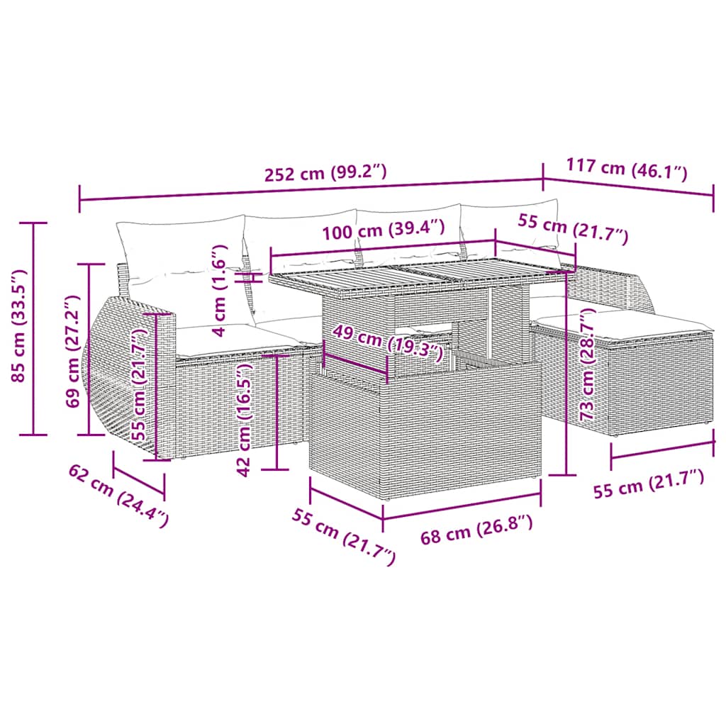 Ta vrtna sedežna garnitura je popoln dodatek za vaše dvorišče, teraso ali verando, saj zagotavlja udoben in vabljiv prostor za klepet z družino in prijatelji ali preprosto za sprostitev in uživanje na prostem. Trpežen material: PE ratan, znan tudi kot poli ratan, je močan sintetični material, ki ne potrebuje vzdrževanja in je videti kot naravni ratan. Je lahek, enostaven za čiščenje in se zaradi svoje vzdržljivosti in odpornosti na vremenske vplive pogosto uporablja za zunanje pohištvo.Funkcija shranjevanja z vodoodporno torbo: Vrtno pohištvo ima pod sedežem prostor za shranjevanje, opremljen z vodoodporno torbo za shranjevanje blazin, igrač in drugih stvari. Notranjo torbo je mogoče varno pritrditi na zunanje pohištvo s kavljem in zanko za večjo stabilnost.Nastavljiva mizna plošča: Z dvigom mizne plošče lahko mizo povišate, s čimer se zunanja klubska mizica spremeni v jedilno mizo. Popolna je za sprejemanje gostov ali uživanje v obrokih na prostem.Prevleko je mogoče odstraniti in oprati: Te sedežne blazine imajo odstranljive prevleke za lažje pranje in vzdrževanje.Modularna zasnova: Ta komplet zunanjega pohištva ima modularno zasnovo, zaradi česar je popolnoma prilagodljiv in enostaven za premikanje, tako da lahko zunanjo garnituro postavite kakor koli želite. Dobro je vedeti:Če želite, da vaše zunanje pohištvo ostane lepo, vam priporočamo, da ga zaščitite z vodoodporno prevleko.