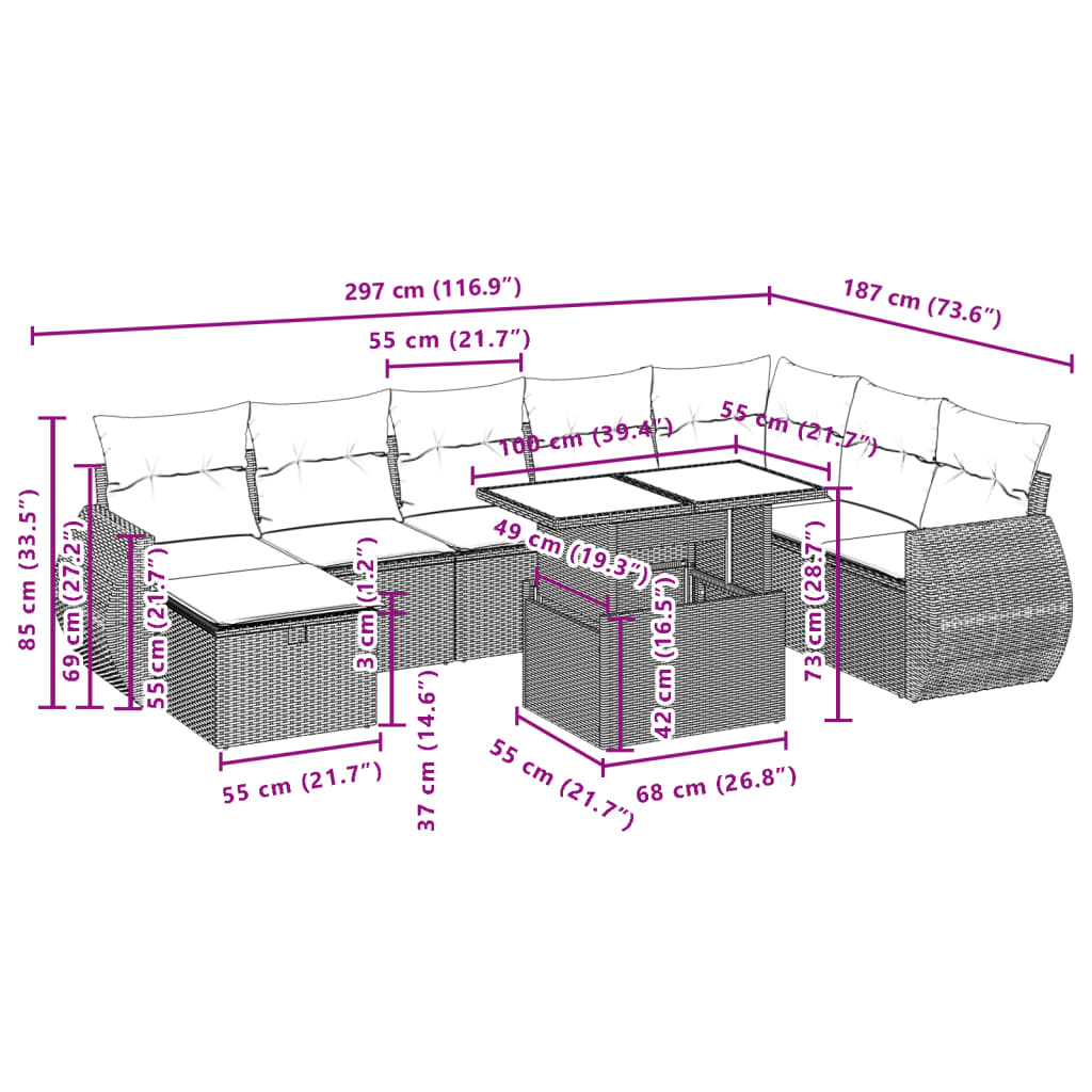 Ta vrtna sedežna garnitura je popoln dodatek za vaše dvorišče, teraso ali verando, saj zagotavlja udoben in vabljiv prostor za klepet z družino in prijatelji ali preprosto za sprostitev in uživanje na prostem. Vzdržljiv material: PE ratan, znan tudi kot poli ratan, je močan sintetični material, ki zahteva malo vzdrževanja in je videti kot naravni ratan. Je lahek, enostaven za čiščenje in se zaradi svoje vzdržljivosti in odpornosti na vremenske vplive pogosto uporablja za zunanje pohištvo.Nastavljiva mizna plošča: Z dvigom mizne plošče lahko mizo povišate, s čimer se zunanja klubska mizica spremeni v jedilno mizo. Popolna je za sprejemanje gostov ali uživanje v obrokih na prostem.Steklena mizna plošča: Površina zunanje mize je izdelana iz močnega in trpežnega kaljenega stekla, kar omogoča enostavno čiščenje z vlažno krpo in vašemu zunanjemu prostoru doda pridih elegance.Prevleko je mogoče odstraniti in oprati: Te sedežne blazine imajo odstranljive prevleke za lažje pranje in vzdrževanje.Modularna zasnova: Ta komplet zunanjega pohištva ima modularno zasnovo, zaradi česar je popolnoma prilagodljiv in enostaven za premikanje, tako da lahko zunanjo garnituro postavite kakor koli želite. Dobro je vedeti:Če želite, da vaše zunanje pohištvo ostane lepo, vam priporočamo, da ga zaščitite z vodoodporno prevleko.