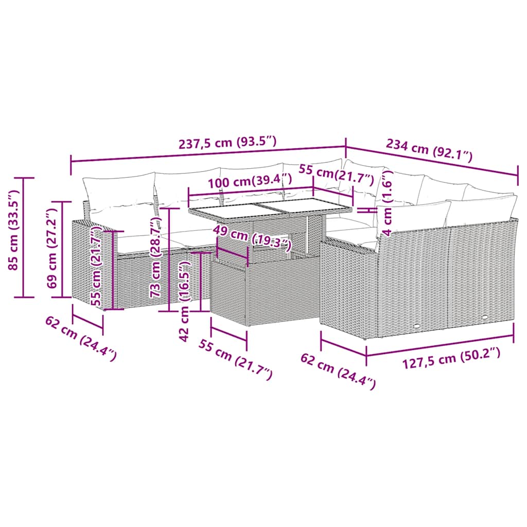 Ta vrtna sedežna garnitura je popoln dodatek za vaše dvorišče, teraso ali verando, saj zagotavlja udoben in vabljiv prostor za klepet z družino in prijatelji ali preprosto za sprostitev in uživanje na prostem. Trpežen material: PE ratan, znan tudi kot poli ratan, je močan sintetični material, ki ne potrebuje vzdrževanja in je videti kot naravni ratan. Je lahek, enostaven za čiščenje in se zaradi svoje vzdržljivosti in odpornosti na vremenske vplive pogosto uporablja za zunanje pohištvo.Funkcija shranjevanja z vodoodporno vrečo: Vsak vrtni sedež ima pod sedežem prostor za shranjevanje, opremljen z vodoodporno vrečo za shranjevanje blazin, igrač in drugih predmetov. Notranja torba ima zgornji pokrov in jo je mogoče varno pritrditi na sedež s kavljem in zanko za večjo stabilnost.Nastavljiva mizna plošča: Z dvigom mizne plošče lahko mizo povišate, s čimer se zunanja klubska mizica spremeni v jedilno mizo. Popolna je za sprejemanje gostov ali uživanje v obrokih na prostem.Prevleko je mogoče odstraniti in oprati: Te sedežne blazine imajo odstranljive prevleke za lažje pranje in vzdrževanje.Robusten in stabilen okvir: Jeklen okvir s prašnim premazom je močan, stabilen, trpežen ter odporen na korozijo in slabe vremenske razmere, kar zagotavlja dolgotrajno delovanje. Dobro je vedeti:Če želite, da vaše zunanje pohištvo ostane lepo, vam priporočamo, da ga zaščitite z vodoodporno prevleko.