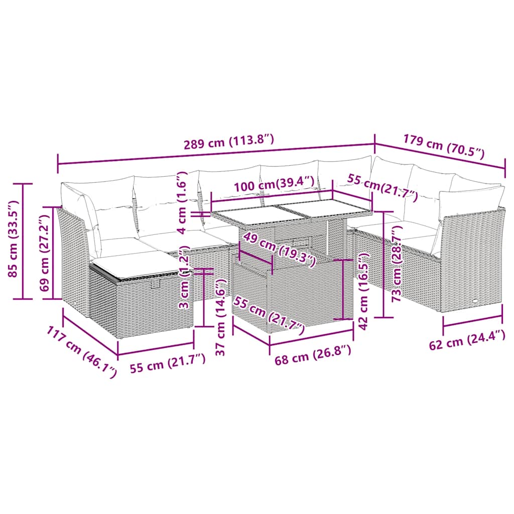 Ta vrtna sedežna garnitura je popoln dodatek za vaše dvorišče, teraso ali verando, saj zagotavlja udoben in vabljiv prostor za klepet z družino in prijatelji ali preprosto za sprostitev in uživanje na prostem.Trpežen material: PE ratan, znan tudi kot poli ratan, je močan sintetični material, ki ne potrebuje vzdrževanja in je videti kot naravni ratan. Je lahek, enostaven za čiščenje in se zaradi svoje vzdržljivosti in odpornosti na vremenske vplive pogosto uporablja za zunanje pohištvo.Funkcija shranjevanja z vodoodporno vrečo: Vsak vrtni sedež ima prostor za shranjevanje pod sedežem, skupaj z vodoodporno vrečo za shranjevanje blazin, igrač in drugih predmetov. Notranje vreče imajo zgornjo prevleko in jih je mogoče s pomočjo primenjal varno pritrditi na sedeže za dodatno varnost.Prevleko je mogoče odstraniti in oprati: Te sedežne blazine imajo odstranljive prevleke za lažje pranje in vzdrževanje.Modularna zasnova: Ta komplet zunanjega pohištva ima modularno zasnovo, zaradi česar je popolnoma prilagodljiv in enostaven za premikanje, tako da lahko zunanjo garnituro postavite kakor koli želite.Dobro je vedeti:Če želite, da vaše zunanje pohištvo ostane lepo, vam priporočamo, da ga zaščitite z vodoodporno prevleko.