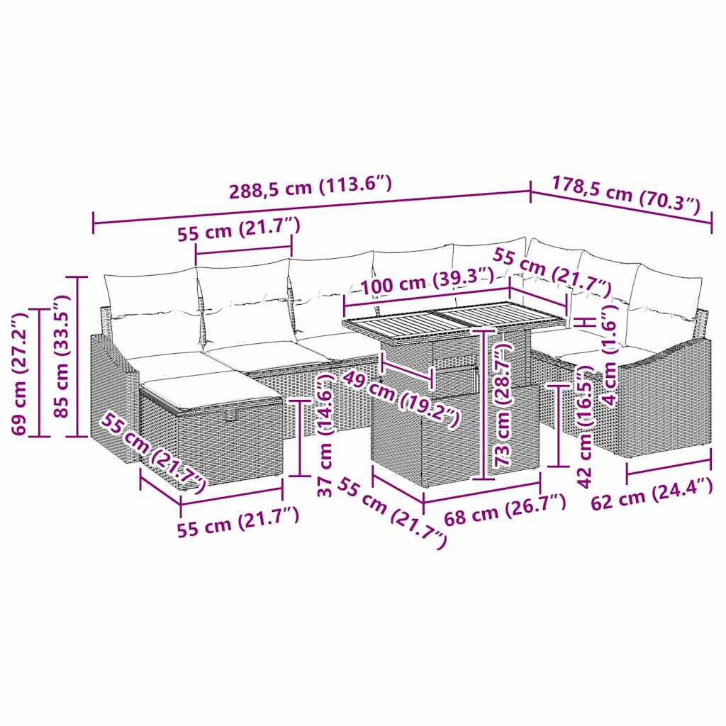 Ta eleganten moderni vrtnarski kavč dokaz je sodobnega oblikovanja, ki nudi preprostost in izjemno funkcionalnost, primerno za vsak zunanji prostor. Popolnoma združuje slog in udobje, s čistimi linijami in minimalističnim izgledom, kar je idealno za tiste, ki cenijo urejen videz brez žrtvovanja praktičnosti. Ne glede na to, ali organizirate zunanjo zabavo ali preprosto uživate na soncu, ta set spremeni vsak vrt ali teraso v prijetno zavetje, zasnovano za izpolnjevanje vseh vaših potreb. Premium konstrukcija iz poli ratana Poli ratan ne le da izgleda dobro, ampak je tudi zelo praktičen. UV-odporen in zelo trpežen, prenese zunanje obremenitve, preprečuje bledenje in poškodbam zaradi sonca, kar ohranja vaš prostor videti svež skozi vse sezone. Popolne možnosti sedenja Set vključuje različne vrste sedežev: 4 sredinske sedeže, 1 kotni sedež, 2 naslonjalska kavča in footstool, vse pa vključuje mizo, ki se hitro preklopi iz kavne mize na jedilno. Vsaka komponenta je zasnovana za udobje, kar omogoča sproščena druženja ali žive obroke. Funkcionalna miza z nastavljivo višino Inovativna zasnova mize omogoča enostavno prilagajanje visokosti kavne in jedilne mize, kar je super za širok spekter zunanjih aktivnosti, od jutranje kave do večerje pod zvezdami. Vsestrana postavitev in uporaba Modularna zasnova omogoča preoblikovanje, ki se prilagaja vsakemu okolju ali priložnosti; preuredite ali združite sedeže za intimne pogovore ali večje prireditve. Enostavno vzdrževanje Ohranite set v dobrem stanju tako, da ga prekrijete, ko ga ne potrebujete. Redno brisanje s krpo zadostuje, da ostane videti svež in moderen.