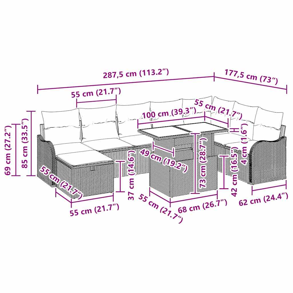 Ta super modularni vrtni kavč je idealen za preobrazbo vsakega vrta ali terase v prijetno oazo. Njegov čist in moderen stil nudi odlično kombinacijo udobja in praktičnosti za zunanje prostore. Modularna zasnova omogoča, da si sedenje postavite po svoje, kar je super za druženja ali preprosto sprostitev. Material poli ratan: Kavč je narejen iz kakovostnega poli ratana, kar ne le pripomore k šik videzu, ampak je tudi zelo odporen proti vremenskim vplivom. Poli ratan zagotavlja, da bo vaše pohištvo ostalo lepo in funkcionalno tudi v prihodnjih sezonah. Super izbira za tiste, ki želijo lepo in dolgo trdno pohištvo za zunaj. Vključeni komponenti: Ta set vključuje različne elemente, kot so kavči z rokami, srednji in kotni sedi, kar omogoča prilagodljivo postavitev. Miza iz kaljenega stekla dodaja pridih elegance in ponuja trdno mesto za pijače ali obroke. Vsebuje tudi footstool in mehke blazine za še več udobja. Te komponente so zasnovane tako, da nudijo fleksibilno sedenje, primerno za vsak vrt. Funkcionalne značilnosti: S višinsko nastavljivo mizo, ki jo lahko hitro spremenite iz kave v jedilno mizo, je ta funkcija odlična za sproščene pogovore ali večerje na prostem. Ima tudi skrite predale za shranjevanje, kjer lahko spravite blazine ali druga orodja in tako ohranite prostor brez nered. Priporočena uporaba: Ta set je popoln za zunanje terase, vrtove in lounge prostore, saj je odličen za zabave. Njegova fleksibilna zasnova in postavitev omogočata gostitev sproščenih brunchov, živahnih zabav ali mirnih večerov. Idealno za tiste, ki iščejo prilagodljive postavitve, ki nudijo udobje in stil. Vzdrževanje: Da ohranite lep videz, ga pokrijte, ko ga ne uporabljate, da ga zaščitite pred vremenskimi vplivi. Enostavno brisanje s suho krpo bo zagotovilo čistočo, blazine pa enostavno shrani, da jih zaščitite pred dežjem. Ta minimalistična skrb zagotavlja, da boste lahko dolgotrajno uživali v svojem zunanjem prostoru.