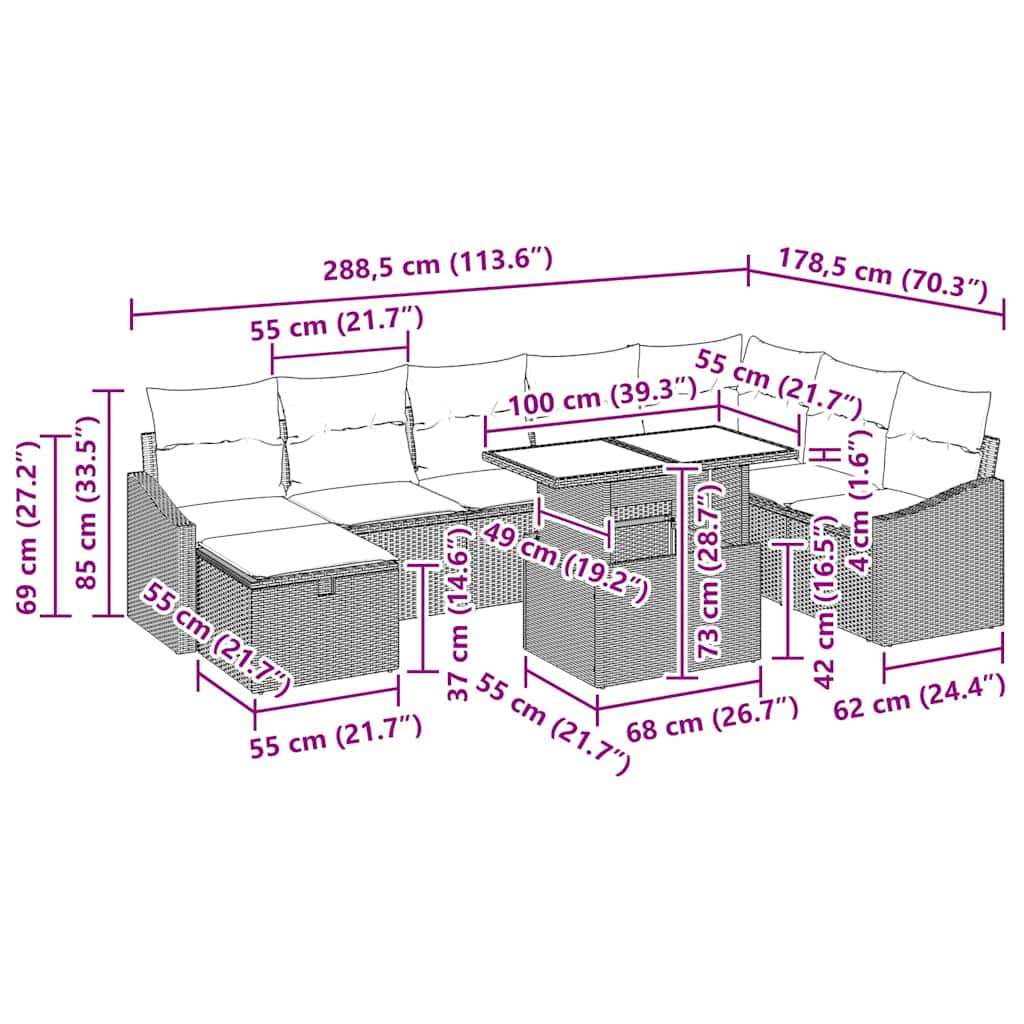 Ta modularni vrtni kavč prinaša udobje in stil v vaš zunanji prostor. Sodobna zasnova klasično združuje preprostost in funkcionalnost s čistimi linijami. Perfektno se prilega različnim zunanjim nastavitvam in dodaja pridiha sofisticiranosti, hkrati pa skrbi za vaše udobje. Predstavljajte si vrtne zabave ali mirne večere v vašem vrtu – ta set dvigne vsako priložnost. Gladka površina nudi moderen videz, ki sledi sodobnim trendom. Vzdržljiva konstrukcija Okvir seta iz prašno lakiranega jekla zagotavlja stabilnost in dolgo življenjsko dobo. Modularna zasnova omogoča enostavne prilagoditve, ideane za vaš zunanji prostor. Njegova trdna struktura nudi zanesljivo sedenje za vsako priložnost ter obljublja dolgo obstojnost. Praktične shranjevalne možnosti Vsak kos vključuje skrite shranjevalne prostore, ki pomagajo ohranjati red v zunanjih prostorih. Te rešitve povečujejo funkcionalnost kavčnega seta in so super za tiste, ki radi organizirajo svoje stvari. Vsestranska funkcionalnost Sedeži so oblazinjeni s poliestrskimi vlakni za udobno dolgotrajno sedenje. Poli ratan dodaja stil in ergonomske prednosti. UV-odporni materiali varujejo pred bledenjem, tako da set ostaja živahen in prijeten spomladi in poleti. Nagnjena naslonjala za roke zagotavljajo sproščeno držo. Stilska estetika Črna barva se lepo ujema z različnimi zunanjimi dekorji. Njegov dizajn je prefinjen in urejen, kar omogoča enostavno vključitev v vaše zunanje prostore. Ta fleksibilnost poskrbi, da je središče druženja ali osebnega umika, kjer se stil in preprostost srečata. Enostavno vzdrževanje Enostavno je vzdrževati – preprosto pokrijte set, ko ga ne uporabljate, da ohranite svež videz. Minimalna sestava z dvema osebama in izvijačem omogoča hitro postavitev. Ta čudovit kos vrtnarskega pohištva ostaja zanesljiv del vašega zunanjega prostora.