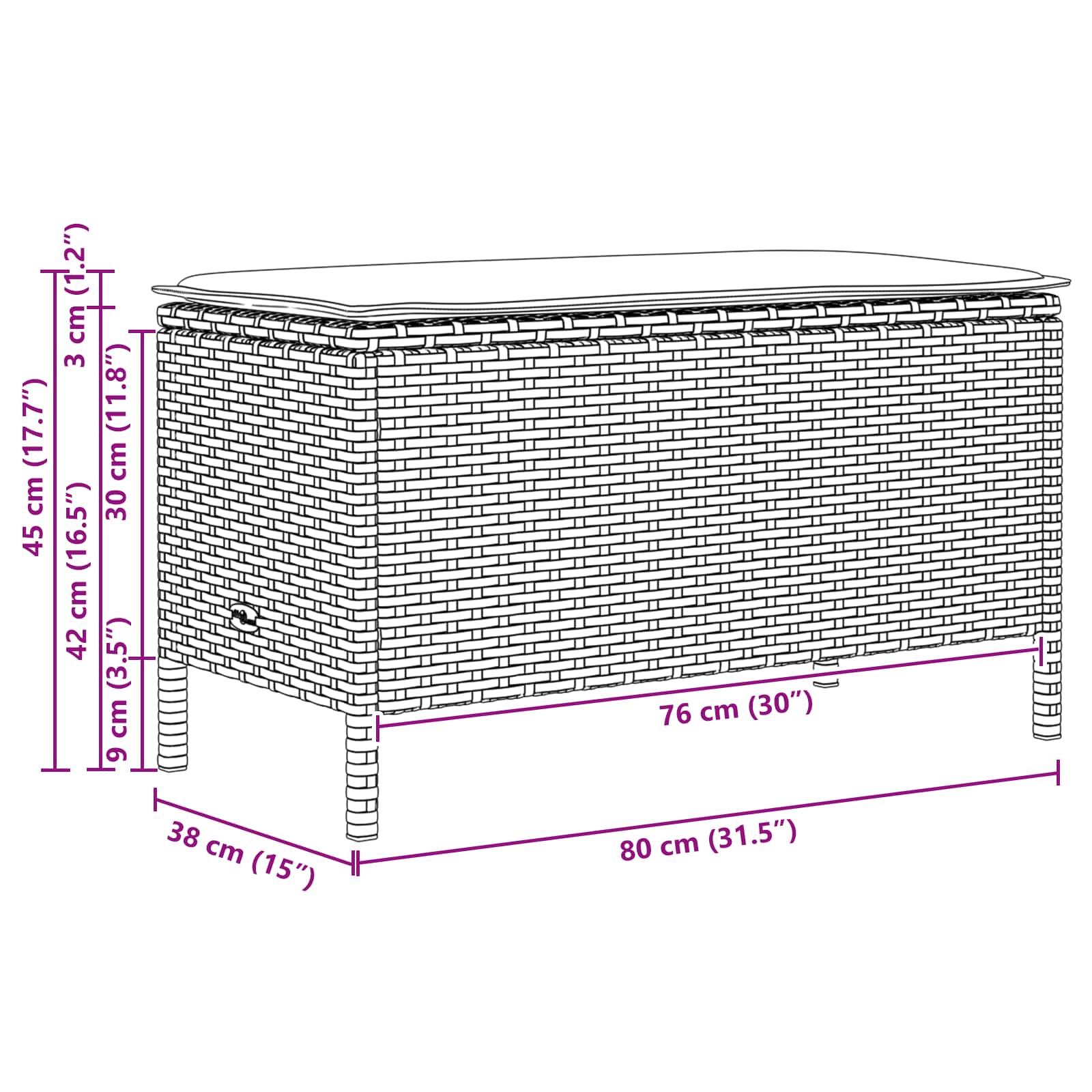 - Splošne dimenzije: 80 x 38 x 42 cm (D x Š x V)