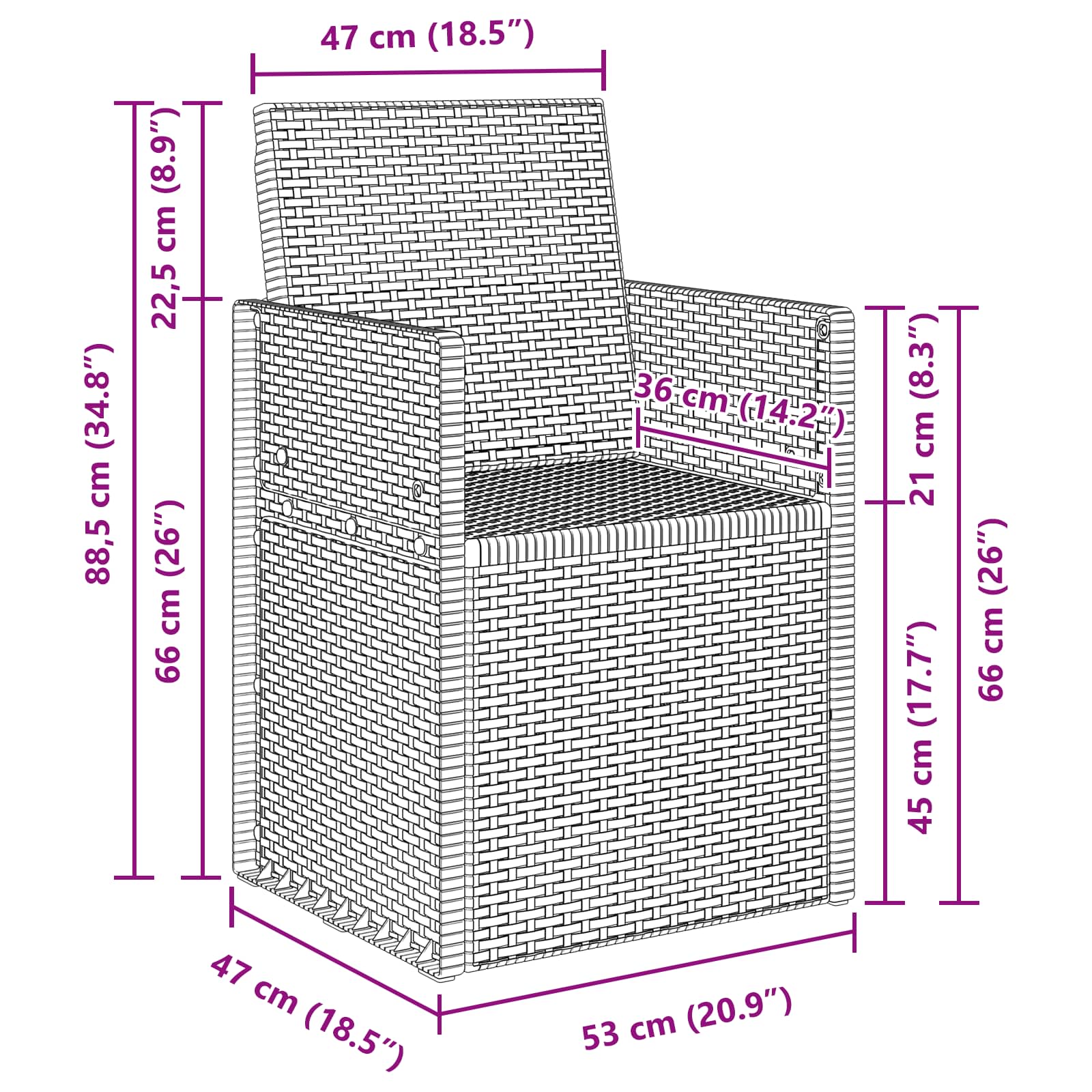 - Splošne dimenzije: 53 x 47 x 88,5 cm (D x Š x V)