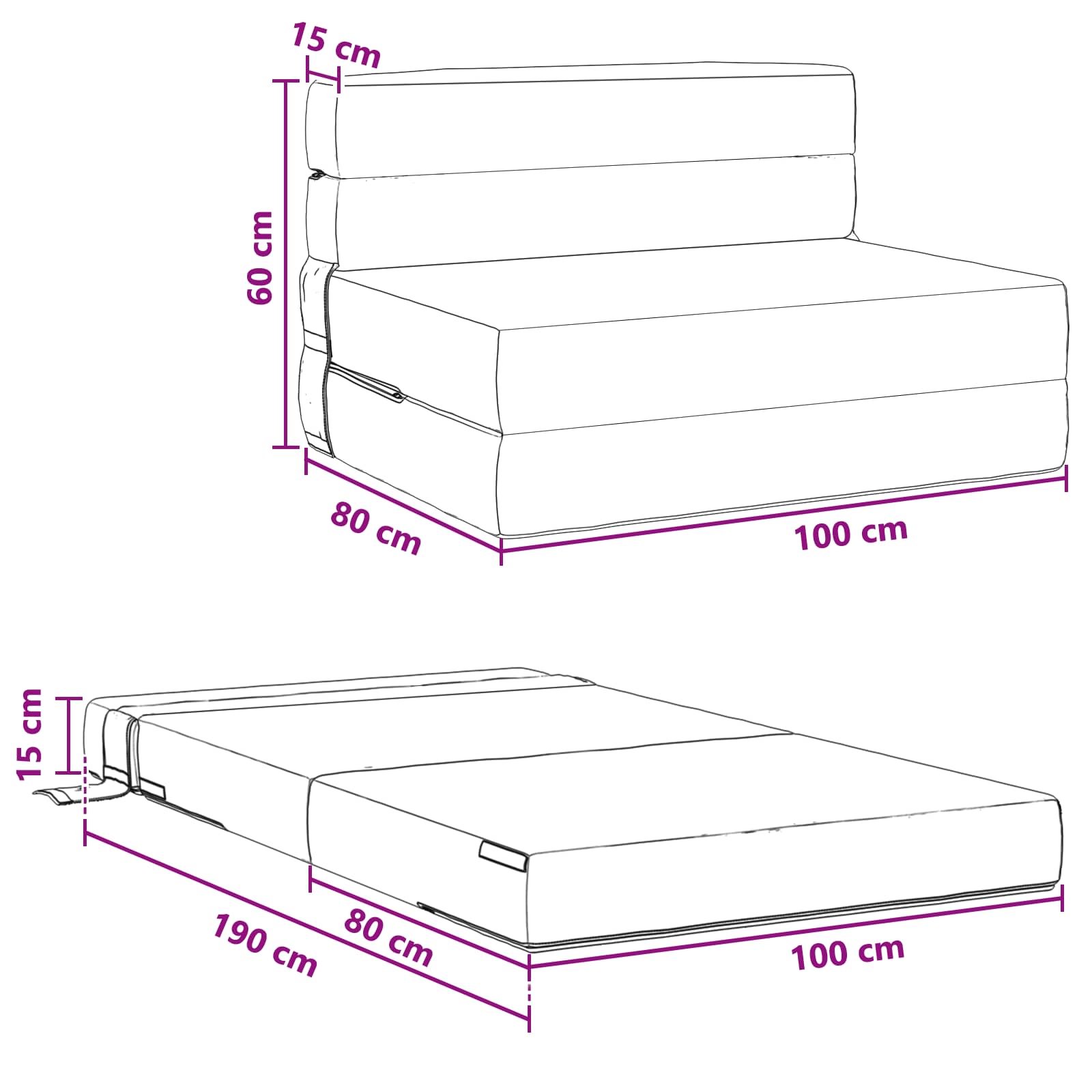 - Splošne dimenzije: 190 x 100 x 15 cm (D x Š x V)