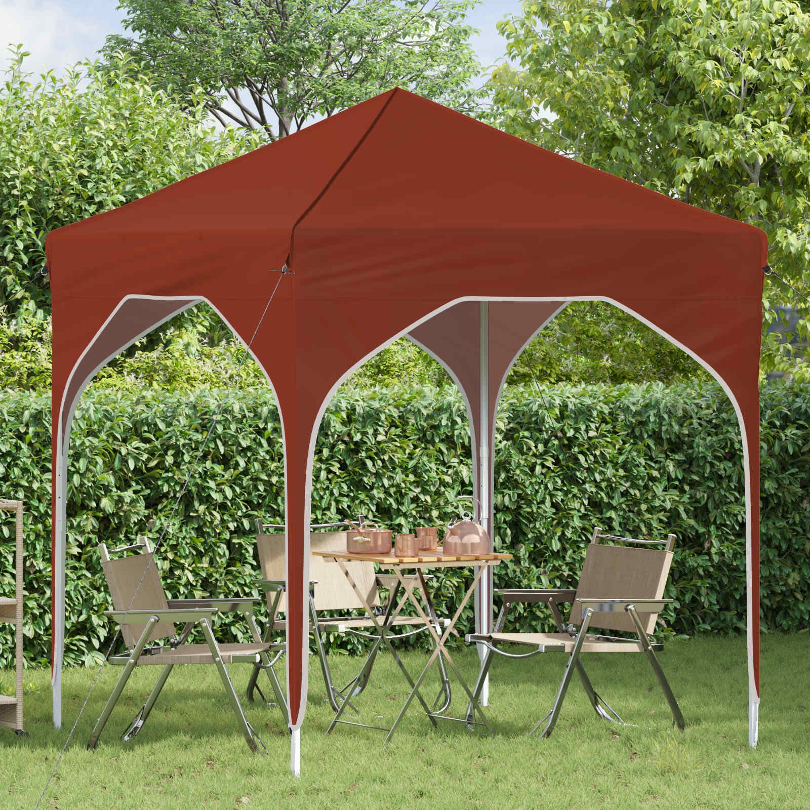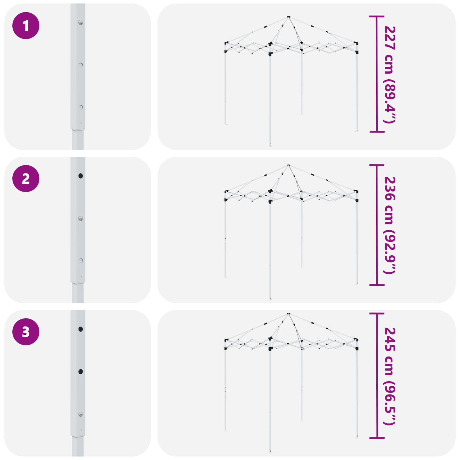 Sodobni šotor za zabave je narejen za izboljšanje vaših zunanjih dogodkov. Ima hiter postavitveni sistem, ki vam omogoči, da več časa preživite ob uživanju, namesto da bi se ukvarjali z logistiko. Ta šotor se prilega različnim priložnostim in nudi zaščito pred nepričakovanim vremenom z vodoodpornimi in UV-odpornimi materiali. Robusten Oxford tekstil: Naš šotor za zabave je narejen iz 210D Oxford tkanine, ki nudi odlično zaščito pred UV žarki in dežjem. Tako so vaši dogodki zaščiteni v soncu ali dežju, kar ga naredi idealnega za poletne zabave ali zunanje dogodke z nepredvidljivim vremenom. Prenosna torba: Šotor prihaja s priročno torbo za prenašanje, kar olajša transport in shranjevanje, ko ga ne potrebujete. Njegova kompaktna zasnova pomeni, da ga lahko enostavno prinesete s seboj na nepričakovane dogodke na prostem. Nastavljiv mehanizem: Naš šotor ima ročno nastavljiv sistem, ki vam omogoča izbiro med tremi nastavitvami višine, ki se gibljejo med 227-245 cm. Ta prilagodljivost je odlična za različne zunanje dogodke, od sproščenih družinskih srečanj do formalnih prireditev. Komponente za varno postavitev: Šotor ima vrvi za veter in klini za stabilno namestitev, kar zagotavlja varnost v vetrovnih razmerah. Te komponente pomagajo ohranjati šotor na mestu, kar vam daje mir med dogodki. Skupno uporabo skozi vse leto: Zasnovan za uporabo kadarkoli, je ta prenosni šotor primeren za različne potrebe skozi vse leto. Ne glede na to, ali prirejate poletni žar ali zimsko vrtno zabavo, njegova funkcionalna zasnova podpira vaš način življenja na prostem. Pri največjem raztezanju ogrodja ne prekrivajte blaga. V nasprotnem primeru se bo blago pretrgalo. Za stabilizacijo vsake noge je veliko bolje uporabiti votlo opeko. Izdelek ni primeren za vremenske razmere, kot so močan veter, sneženje in ekstremne vremenske razmere. Nekateri deli lahko vsebujejo ostre robove, zato po potrebi nosite zaščitne rokavice. Pred sestavljanjem preverite, ali imate vse dele. Otroke in živali naj bodo stran od območja montaže. Pred začetkom se prepričajte, da imate dovolj prostora za razporeditev delov. Ne sestavljajte ali razstavljajte med močnim vetrom. Vse vire ognja in toplote hranite stran od šotora.