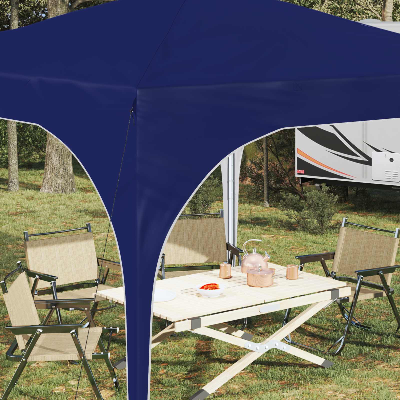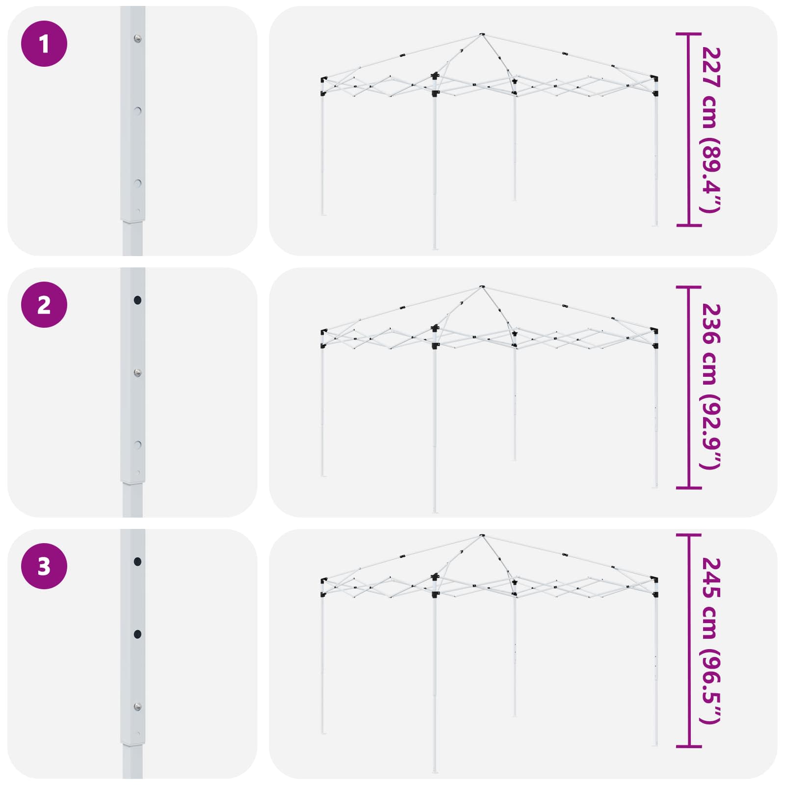 Ta moderni šotor za zabave je odlična rešitev za zunanje dogodke in ga lahko enostavno prilagodiš. Zasnovan je tako, da ustreza različnim priložnostim. Trajna konstrukcija : S trdo 210D Oxford tkanino in srebrnim premazom ta šotor odlično zdrži UV žarke in dež, kar ti daje zanesljivo zaščito med dogodkom. Robustna struktura je odlična za zunanja druženja v vseh vremenskih razmerah. Nastavljiva višina : Šotor se lahko nastavi na tri različne višine, med 227 cm in 245 cm. To ti omogoča prilagoditev višine glede na potrebe dogodka, kar povečuje udobje obiskovalcev. Funkcionalna zasnova : Ta šotor s sodobnim in minimalističnim stilom doda eleganten pridih kateremukoli prostoru. Prašno lakiran jeklen okvir zagotavlja stabilnost, ki podpira šotor tudi v vetrovnih dneh. Prednosti prenosljivosti : Enostavno ga postaviš in pospraviš. Vključena torba olajša prenos in shranjevanje, kar je praktična izbira za organizatorje dogodkov, ki potrebujejo zanesljivo in prenosljivo senco. Praktična oprema : Ta šotor vključuje vse potrebne komponente za hitro postavitev, vključno s torbo, vetrovnimi vrvmi in zemeljskimi žeblji. Dva človeka bosta hitro sestavila šotor in uživala v enostavnem postopku. Pri največjem raztezanju ogrodja ne prekrivajte blaga. V nasprotnem primeru se bo blago pretrgalo. Za stabilizacijo vsake noge je veliko bolje uporabiti votlo opeko. Izdelek ni primeren za vremenske razmere, kot so močan veter, sneženje in ekstremne vremenske razmere. Nekateri deli lahko vsebujejo ostre robove, zato po potrebi nosite zaščitne rokavice. Pred sestavljanjem preverite, ali imate vse dele. Otroke in živali naj bodo stran od območja montaže. Pred začetkom se prepričajte, da imate dovolj prostora za razporeditev delov. Ne sestavljajte ali razstavljajte med močnim vetrom. Vse vire ognja in toplote hranite stran od šotora.