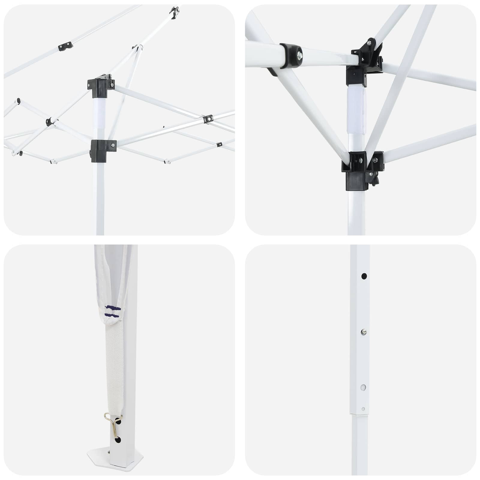 Ta pop-up šotor je prava rešitev za vaša poletna druženja. Ponuja obsežen prostor, kjer se vaši gostje lahko udobno namestijo. Zgrajen je iz vremensko odpornih materialov, ki vas ščitijo pred soncem in rahlim dežjem, kar omogoča, da se vaš dogodek odvija brez skrbi. Z nastavljivim mehanizmom za višino lahko enostavno prilagodite postavitev, kar dodaja prilagodljivost vašim zunanjim dogodkom. Pop-up zasnova: Šotor se hitro postavi z enostavnim mehanizmom, kar vam omogoča, da se osredotočite na zabavo. Nastavljiv mehanizem višine: Ima ročno nastavitev s tremi stopnjami, kar pomeni, da se prilagodi različnim priložnostim. Prašno lakiran jekleni okvir: Zasnova je stabilna in trdna, kar zagotavlja brezskrbno uporabo, tudi v spremenljivih vremenskih pogojih. Vremensko odporen: Ta šotor je vodoodporen in UV zaščiten, kar zmanjšuje tveganje za poškodbe zaradi sonca in dežja. Široka uporaba: Odličen je za zabave, tržnice, piknike in še več, saj nudi zaščito v različnih situacijah. Pri največjem raztezanju ogrodja ne prekrivajte blaga. V nasprotnem primeru se bo blago pretrgalo. Za stabilizacijo vsake noge je veliko bolje uporabiti votlo opeko. Izdelek ni primeren za vremenske razmere, kot so močan veter, sneženje in ekstremne vremenske razmere. Nekateri deli lahko vsebujejo ostre robove, zato po potrebi nosite zaščitne rokavice. Pred sestavljanjem preverite, ali imate vse dele. Otroke in živali naj bodo stran od območja montaže. Pred začetkom se prepričajte, da imate dovolj prostora za razporeditev delov. Ne sestavljajte ali razstavljajte med močnim vetrom. Vse vire ognja in toplote hranite stran od šotora.