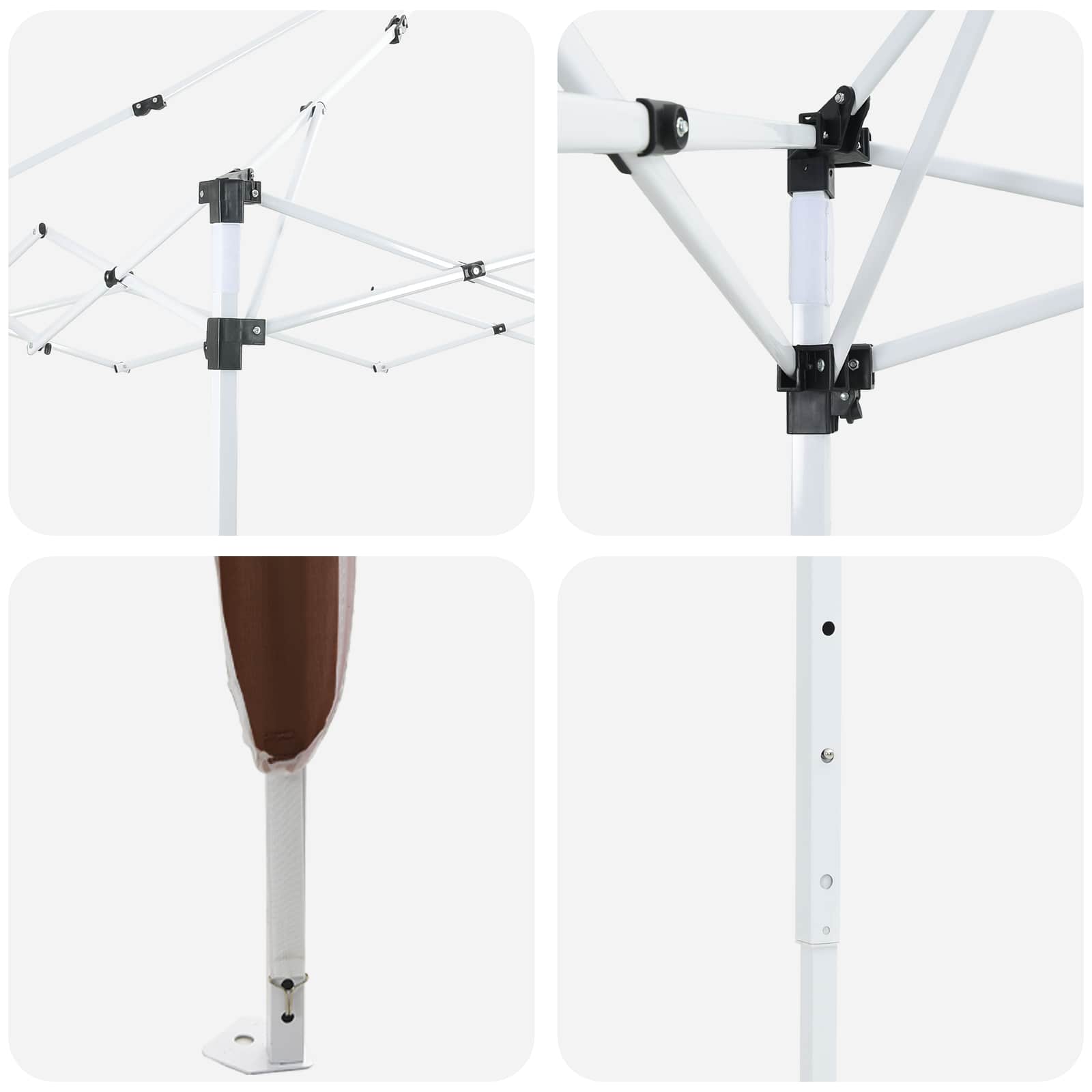 Ta večnamenski šotor za zabave bo vaše zunanje dogodke spremenil v nepozabne izkušnje. Z vrhunskim Oxford tkanjem daje sodoben pridih, s čistimi linijami in funkcionalnostjo. Ne glede na to, ali organizirate vrtnarsko zabavo, poroko ali kakšen večji zunanji dogodek, ta šotor nudi zaščito in prijetno vzdušje. Z veliko pokritostjo in elegantnim dizajnom kombinira stil in funkcionalnost ter izboljšuje vsak dogodek s svojo prisotnostjo. Trajna Oxford tkanina: Glavni material šotora, Oxford tkanina, zagotavlja odlično odpornost proti vremenskim vplivom. Odlikujejo jo vodoodporne lastnosti in UV zaščita, kar omogoča, da vaš prostor pod šotorom ostane udoben in zaščiten pred soncem in rahlim dežjem. Prilagoditev višine: Šotor je mogoče prilagoditi na tri različne višine, kar omogoča fleksibilno zaščito za različne tipe dogodkov. Ne glede na to, ali je to intimno srečanje ali velika prireditev, prilagoditev višine doda uporabnost in optimalno pokritost. Obsežna oprema: Vsebuje 4 vrvice proti vetru in 8 zemeljskih žebljev, kar zagotavlja stabilnost in odpornost na veter. Enostavna postavitev je zasnovana za dva, kar poenostavi proces in je priročna. Hitra postavitev: Ta šotor je opremljen z mehanizmom za hitro postavitev, kar odpravlja dolge postopke postavitve. To je super za gostitelje, ki želijo prihraniti čas in energijo ter hitro pripraviti prostor za goste. Navodila za oskrbo: Da ohranite šotor v dobrem stanju, se izogibajte grobim kemikalijam. S pravilno oskrbo bo material in struktura dolgo vzdržala, kar omogoča dolgotrajno uživanje pri različnih dogodkih. Pri največjem raztezanju ogrodja ne prekrivajte blaga. V nasprotnem primeru se bo blago pretrgalo. Za stabilizacijo vsake noge je veliko bolje uporabiti votlo opeko. Izdelek ni primeren za vremenske razmere, kot so močan veter, sneženje in ekstremne vremenske razmere. Nekateri deli lahko vsebujejo ostre robove, zato po potrebi nosite zaščitne rokavice. Pred sestavljanjem preverite, ali imate vse dele. Otroke in živali naj bodo stran od območja montaže. Pred začetkom se prepričajte, da imate dovolj prostora za razporeditev delov. Ne sestavljajte ali razstavljajte med močnim vetrom. Vse vire ognja in toplote hranite stran od šotora.