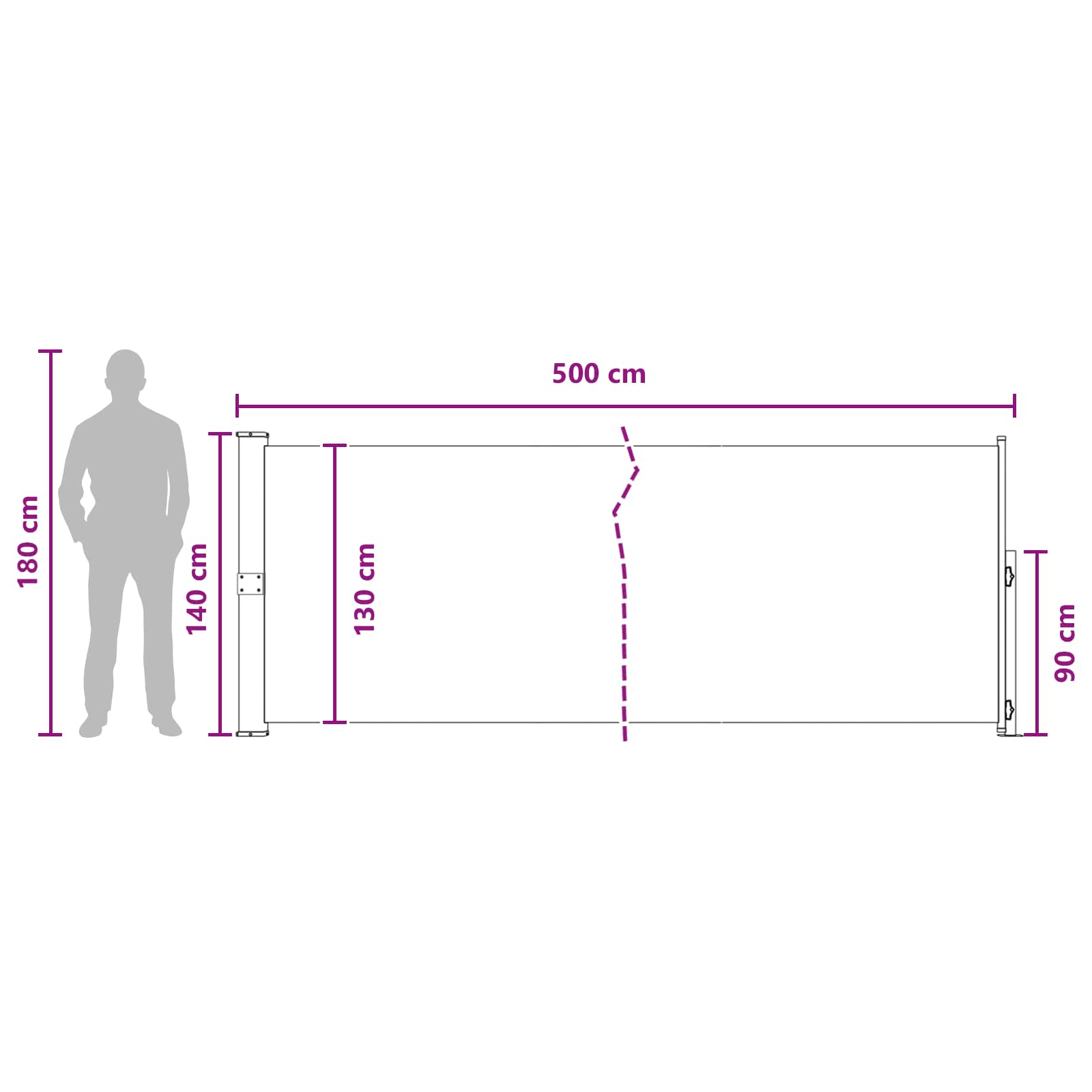 To trpežno retraktilno stransko senčilo nudi kar najboljšo zasebnost in senco za vaš zunanji prostor. Zasnovano je za funkcionalnost in stil, kar vam omogoča, da zaščitite svoj teraso, patio ali vrt pred močno sončno svetlobo in radovednimi pogledi. Njegova moderna oblika se enostavno ujema z različnimi stilskimi elementi na prostem. Poliester : Z 100% poliestrskim materialom in poliuretanskim premazom, je to retraktilno senčilo zasnovano, da prenese močne UV žarke in slabo vreme, kar zagotavlja dolgo življenjsko dobo. Popolna montažna oprema : Ta izdelek ima vse potrebno, da hitro in enostavno postavite senčilo na svoje mesto, kar omogoča varno in hitro namestitev. Retraktilna mehanika : Senčilo se samodejno zvije, zato ga lahko prilagodite po svojih potrebah, brez težav. Vsestrana uporaba : Super za terase, vrtove, verande ali karkoli drugega, kar potrebuje dodatno senco ali zasebnost. Kakšno zabavo načrtujete na prostem? To senčilo vam bo olajšalo udobje. Minimalno vzdrževanje : Pralno je tako enostavno kot postopek čiščenja z milom in vodo, kar vam pomaga ohranjati videz skozi čas. Pozor: nevarnost poškodb! Pri popravilu, spreminjaju, razstavljanju in odstranjevanju senčilnega sistema je treba dele, ki so pod napetostjo (npr. zložljive ročice, protinapetostni sistemi), popolnoma sprostiti ali predhodno zavarovati. Za to je treba naročiti strokovnjaka! • Tende ne uporabljajte, če je poškodovana in potrebuje popravilo ali nastavitev. Stransko markizo je treba umakniti, če hitrost vetra presega 28 km/h. Stransko markizo je treba umakniti v primeru slabih vremenskih razmer, kot sta močan dež ali sneg. Uporaba v zmrzali lahko poškoduje izdelek. Pozor: nevarnost požara! V bližini tende ne uporabljajte žarov, grelnikov, opreme za kuhanje ali sveč. Med namestitvijo bodite previdni, saj obstaja nevarnost zmečkanin in strganja. Med namestitvijo bodite previdni s prsti. Da preprečite nevarnost zadušitve, hranite to plastično torbo stran od dojenčkov in otrok. Te torbe ne uporabljajte v zibelkah, posteljah, vozičkih ali stajicah. Ta torba ni igrača. Nevarnost! Nevarnost zadušitve, majhne delce hranite izven dosega otrok!