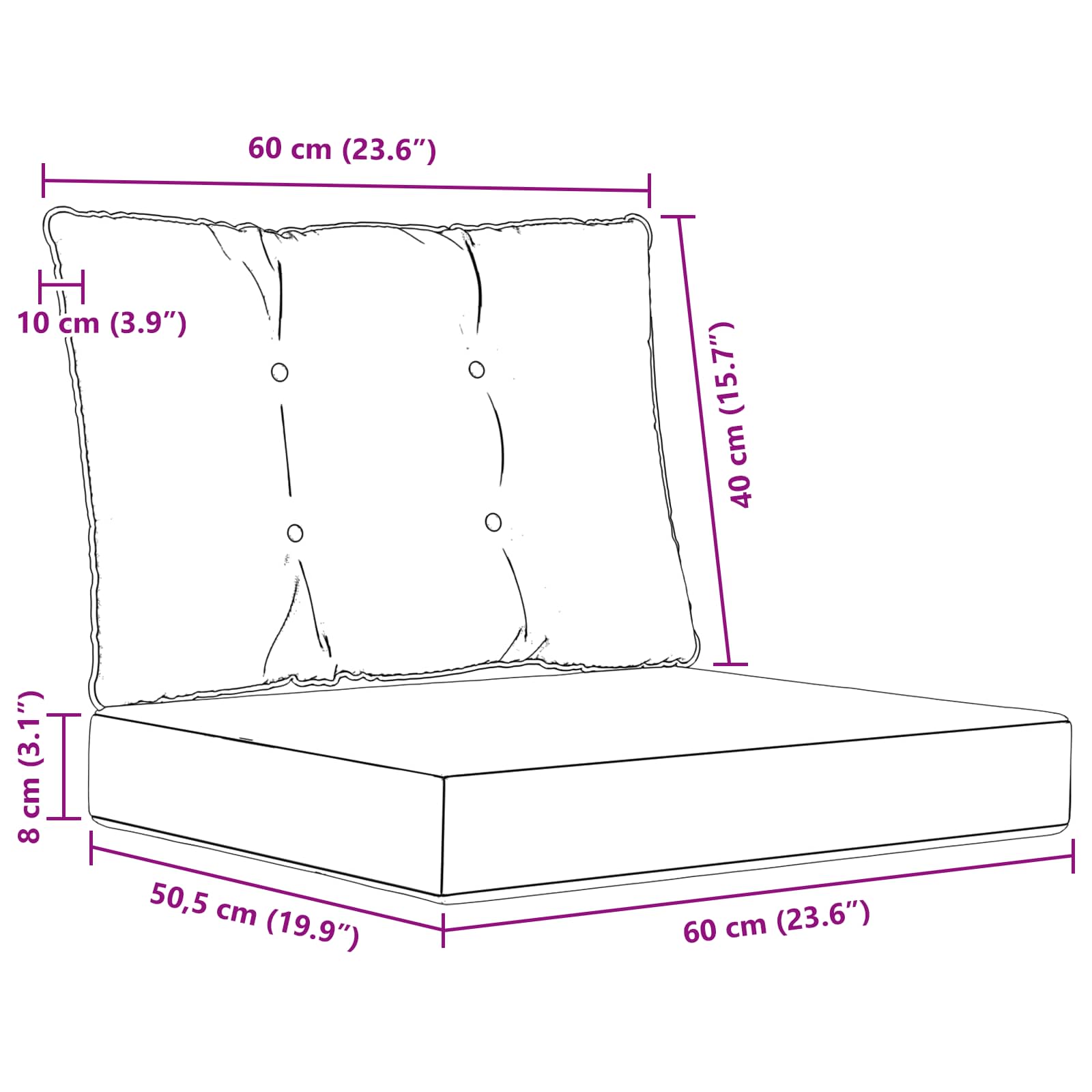 - 1 x sedežna blazina: 60 x 50,5 x 8 cm (D x Š x V)