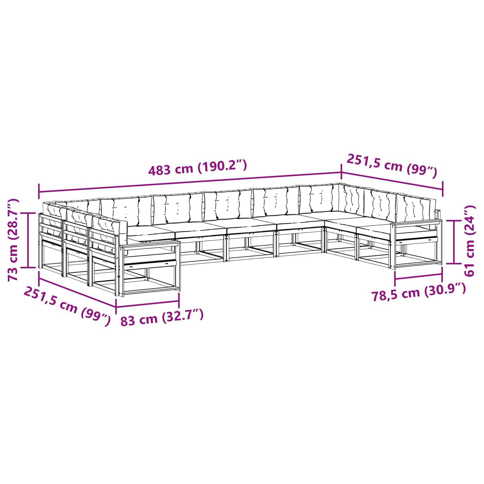 - 10 x Sedežna blazina: 80 x 80 x 8 cm (D x Š x V)