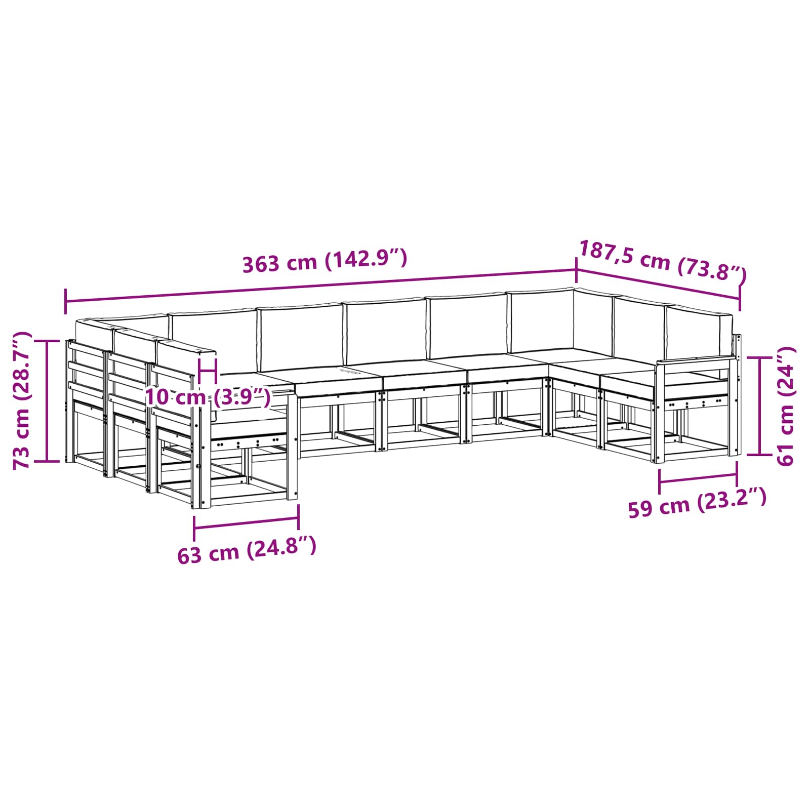 - 10 x sedežna blazina: 60 x 60 x 8 cm (D x Š x V)