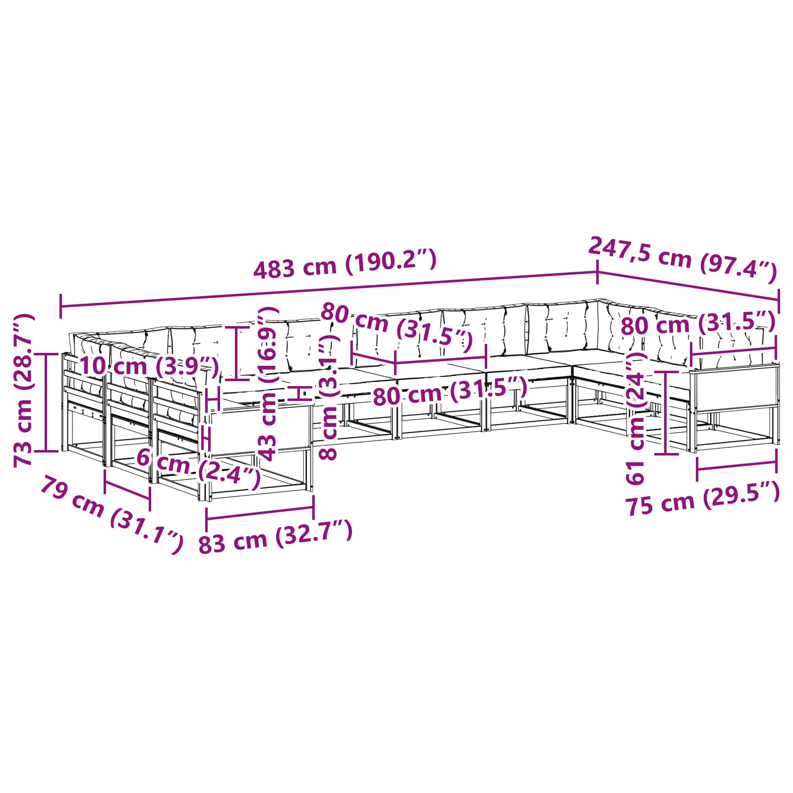 - 10 x blazina za sedež: 80 x 80 x 8 cm (D x Š x T)