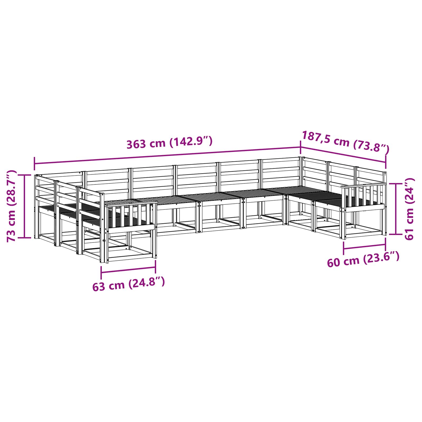 - 2 x naslonjalo: 60 x 6 x 61 cm (D x Š x V)