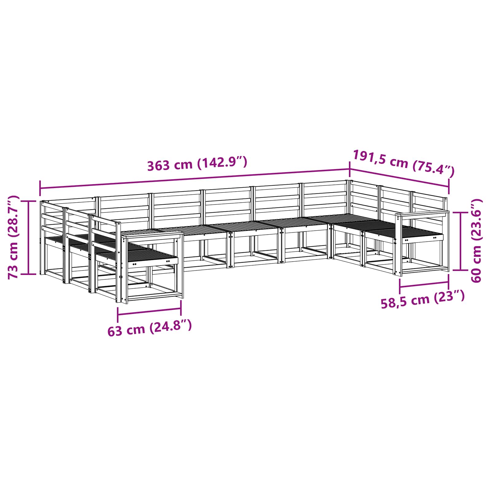 - 8 x sredinska sedežna: 59 x 63 x 73 cm (D x Š x V)