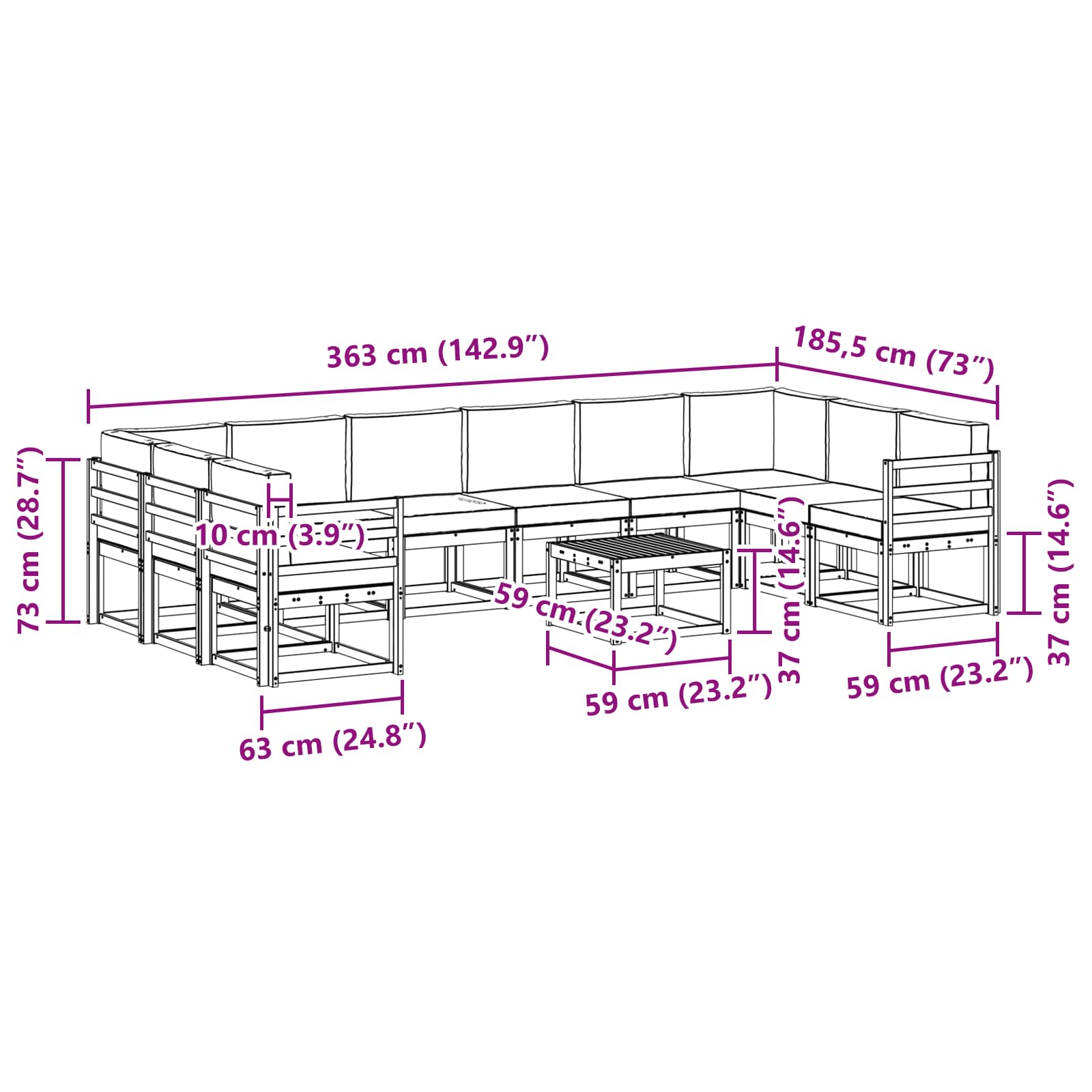 - 10 x sedežna blazina: 60 x 60 x 8 cm (D x Š x V)