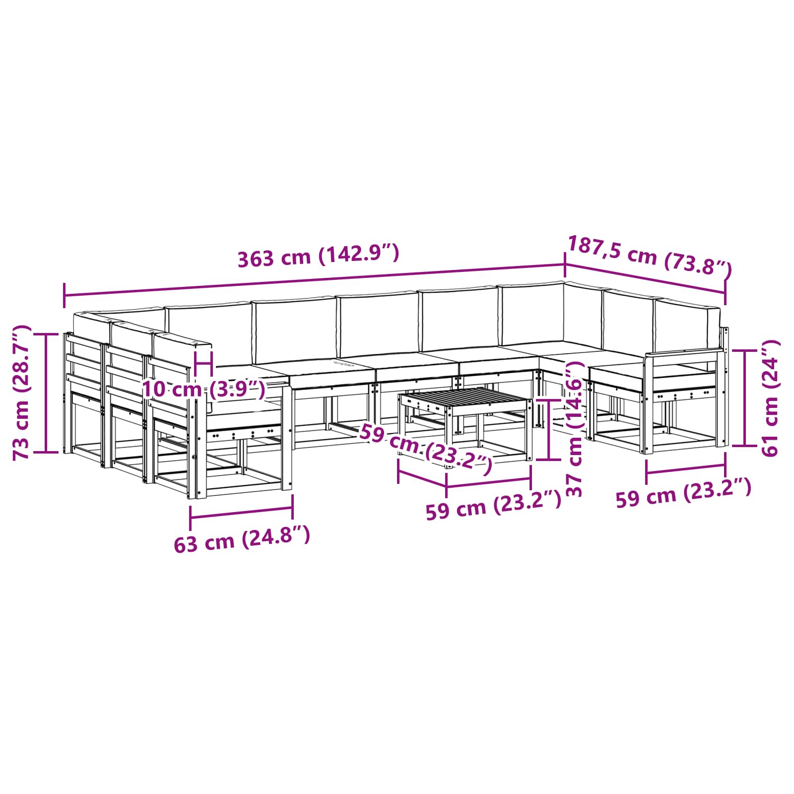 - 10 x sedežna blazina: 60 x 60 x 8 cm (D x Š x V)