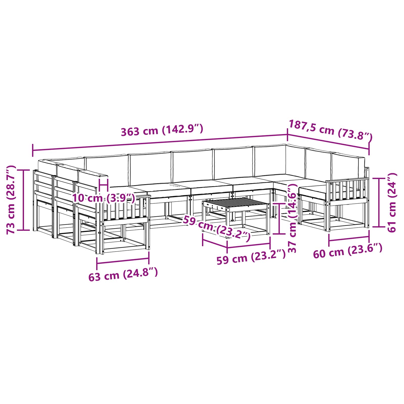 - 10 x sedežna blazina: 60 x 60 x 8 cm (D x Š x V)