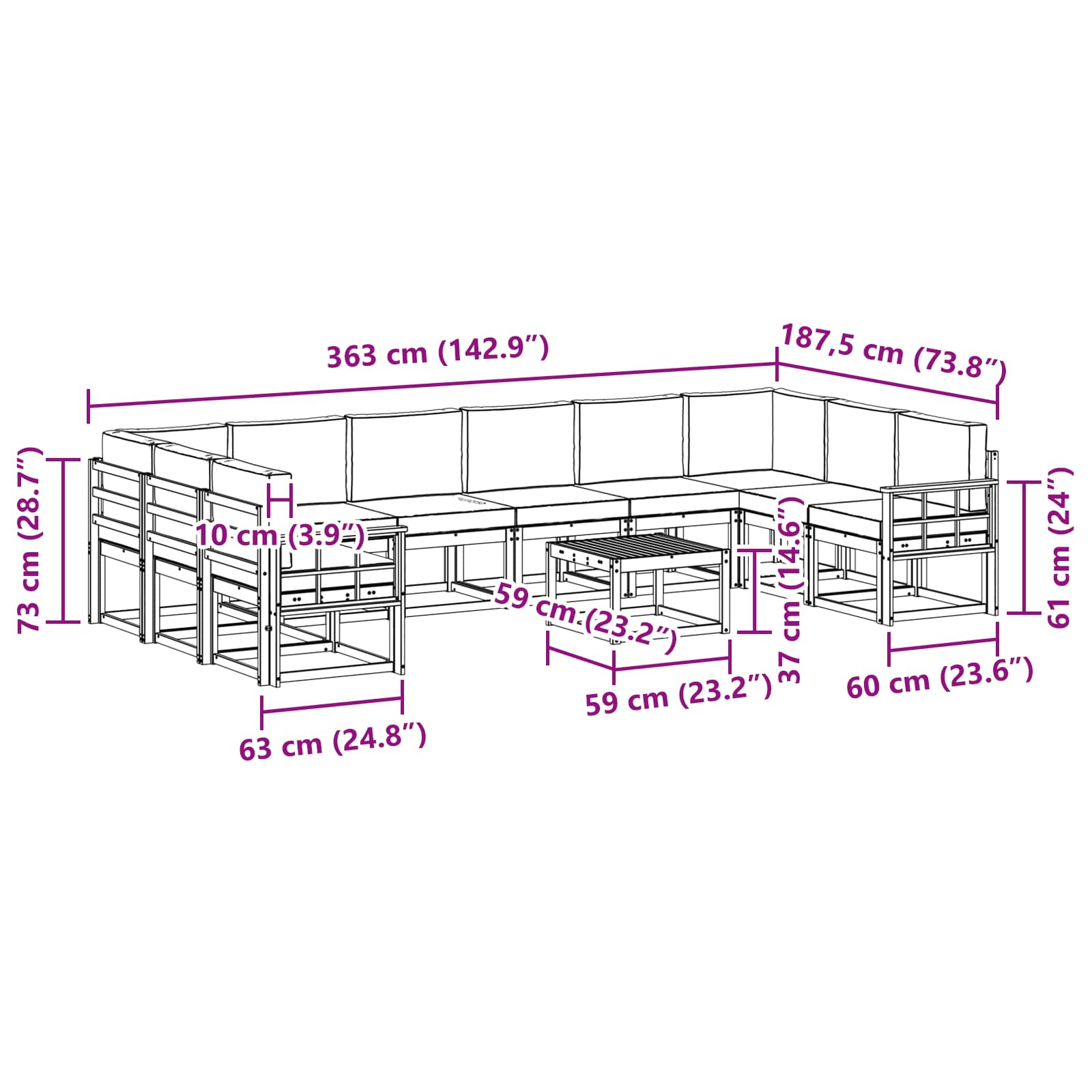- 10 x sedežna blazina: 60 x 60 x 8 cm (D x Š x V)