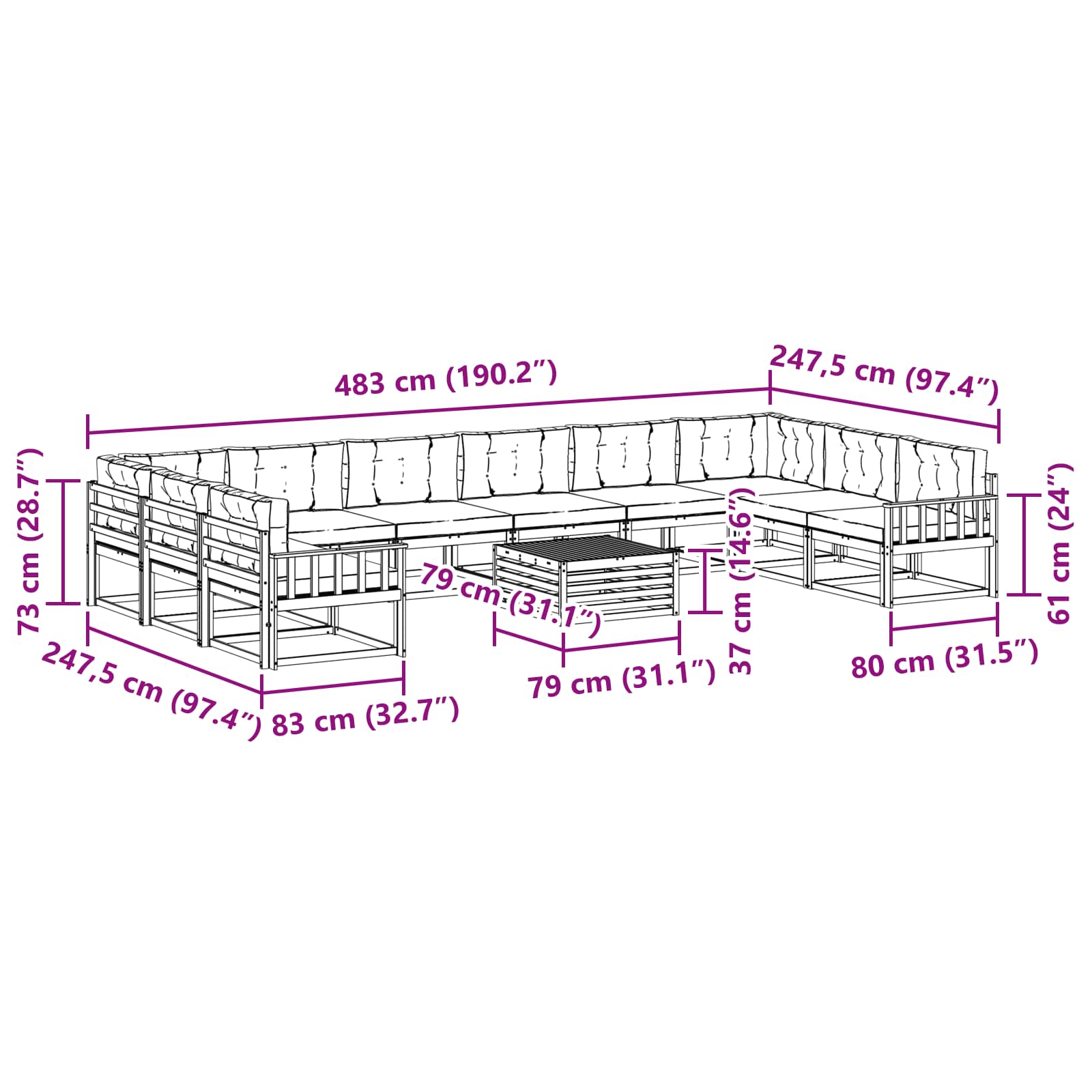 - 12 x Sedežna blazina: 80 x 43 x 10 cm (D x Š x V)