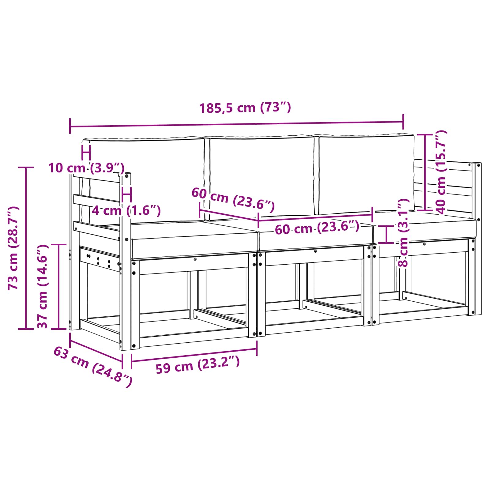 - 3 x Sedežna blazina: 60 x 60 x 8 cm (D x Š x V)