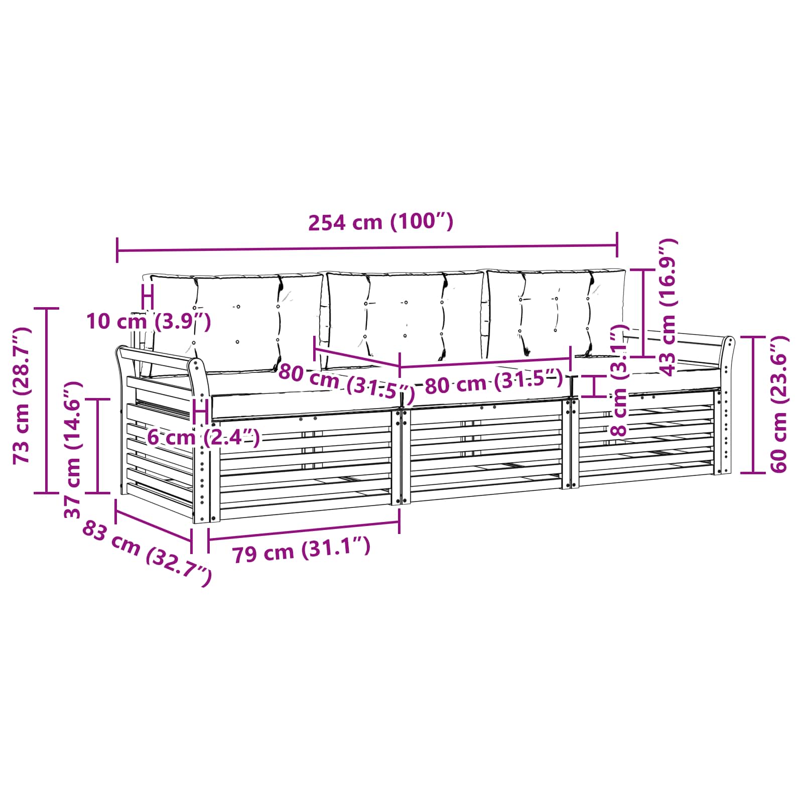 - 3 x Zadnja blazina: 80 x 43 x 10 cm (ŠxVxG)