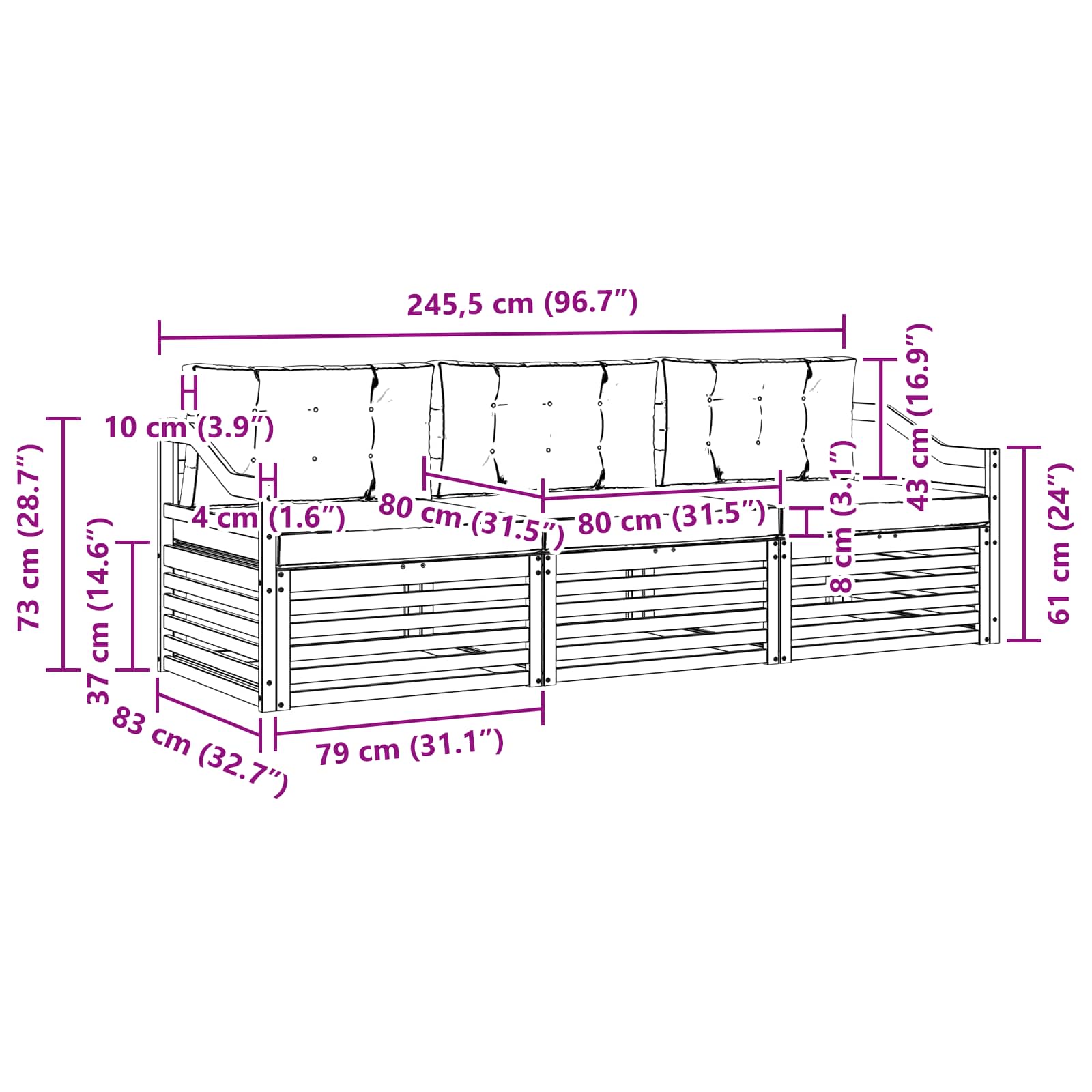 - 3 x Zadnja blazina: 80 x 43 x 10 cm (ŠxVxG)