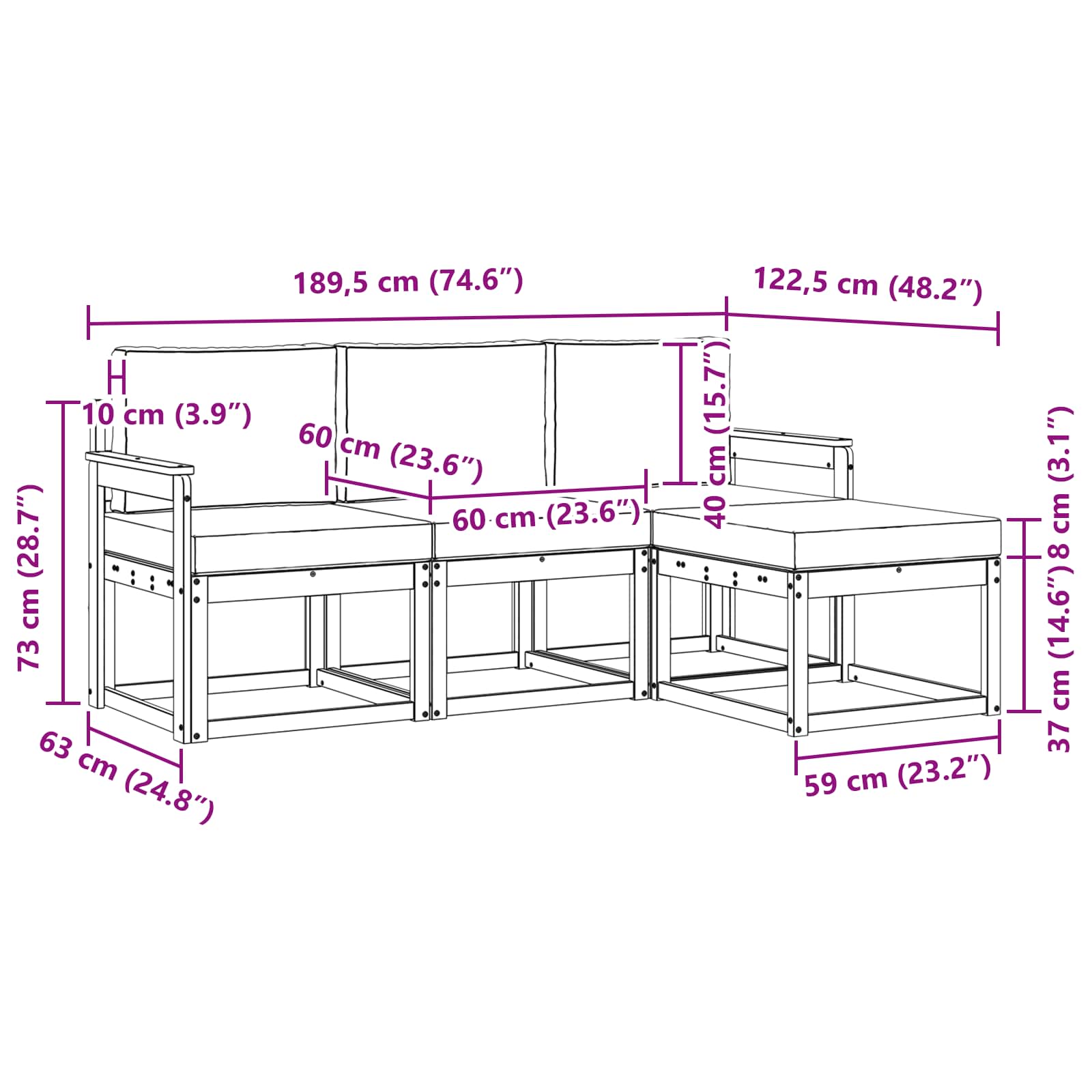 - 4 x sedežna blazina: 60 x 60 x 8 cm (D x Š x V)