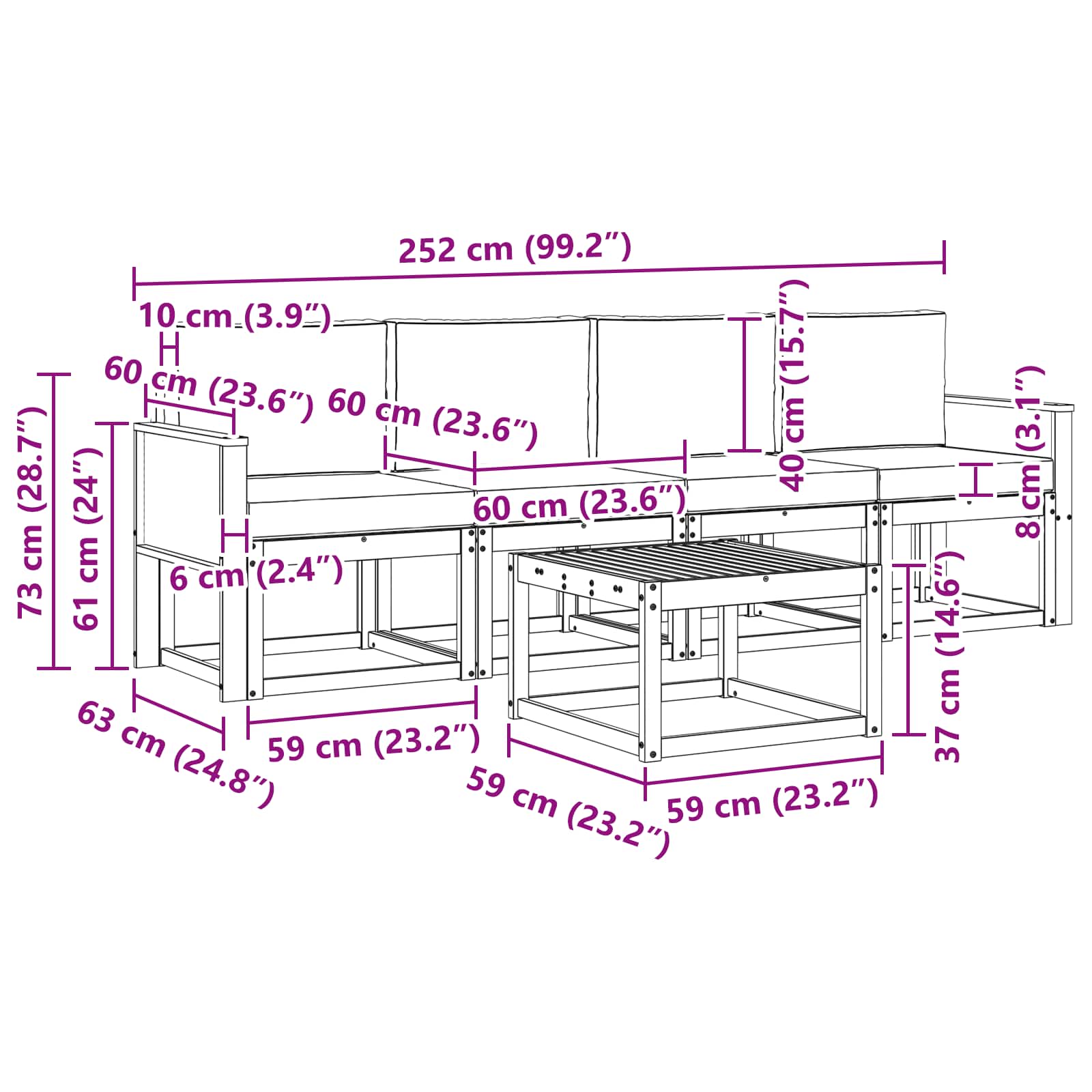 - 4 x Sedežna blazina: 60 x 60 x 8 cm (D x Š x V)