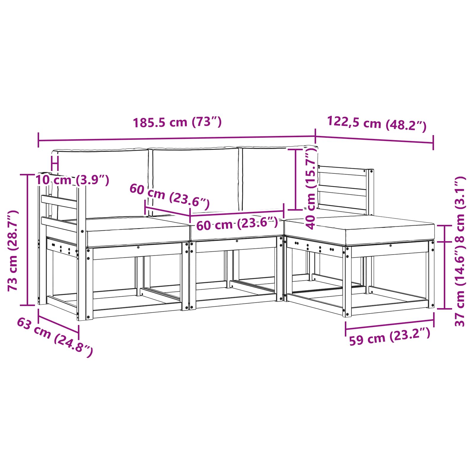 - 4 x sedežna blazina: 60 x 60 x 8 cm (D x Š x V)