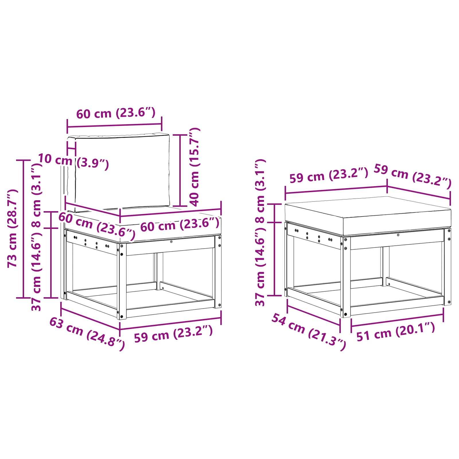 - 1 x poflošček: 59 x 59 x 37 cm (D x Š x V)