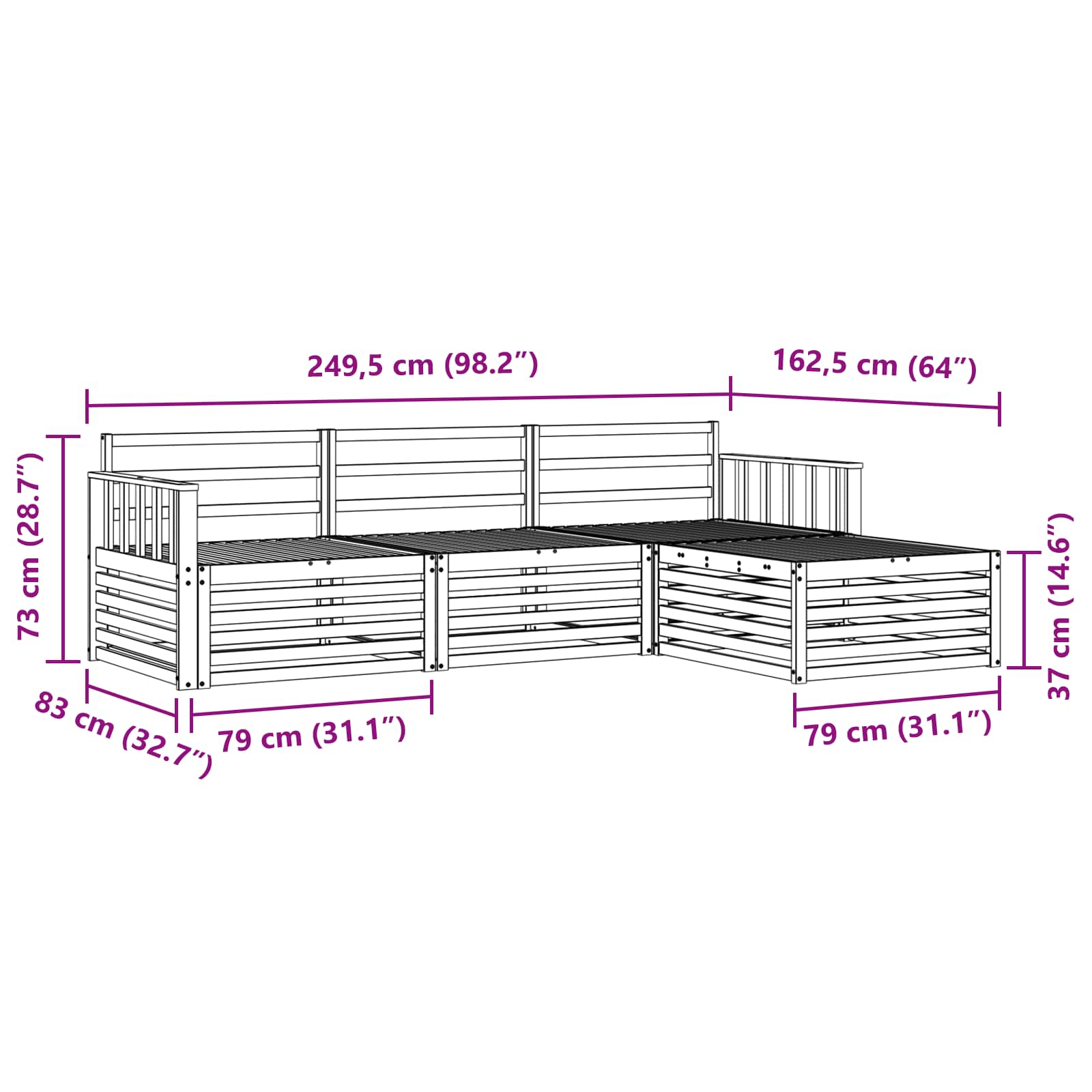 - 3 x Srednji kavč: 79 x 83 x 73 cm (D x Š x V)