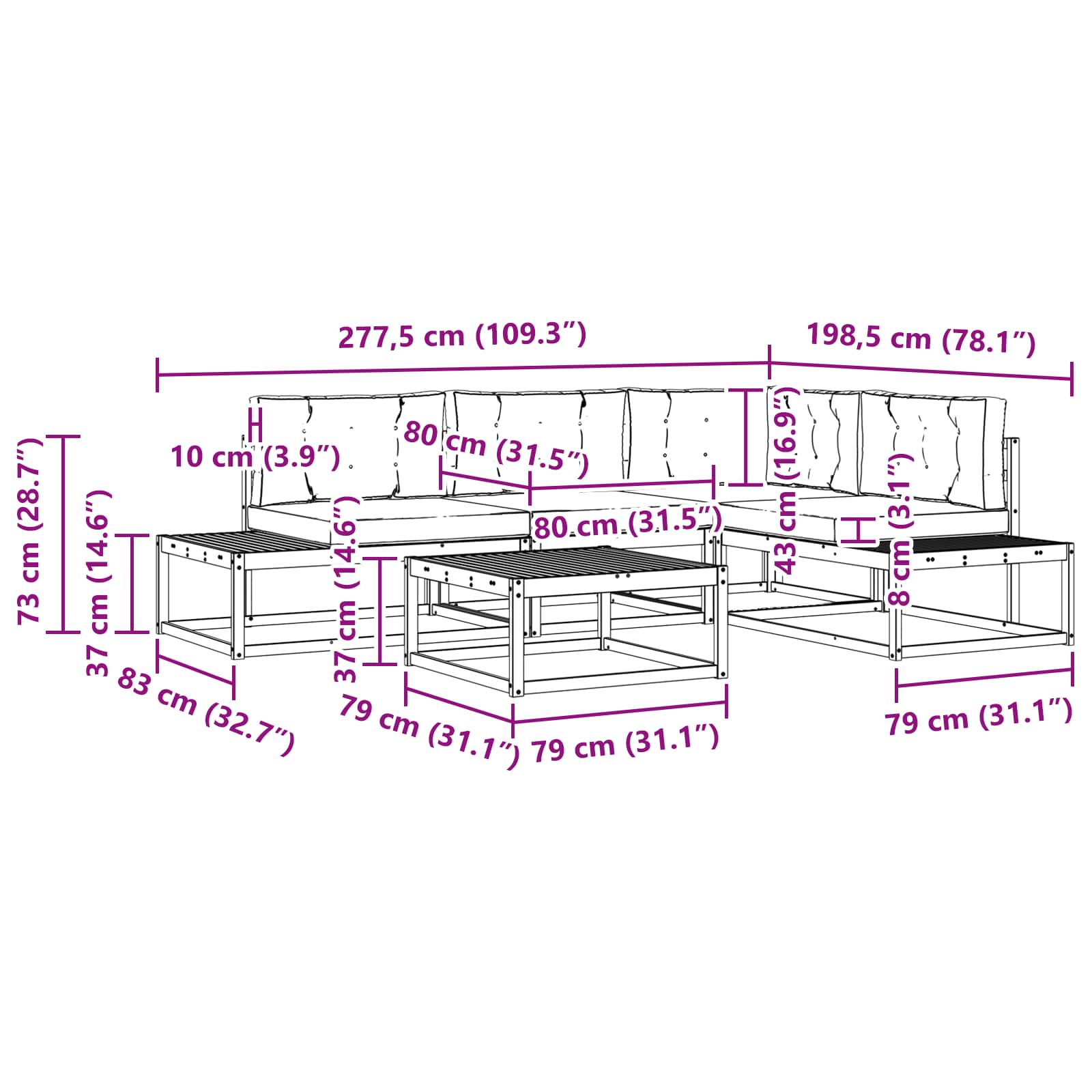 - 4 x sedežna blazina: 60 x 60 x 8 cm (D x Š x V)