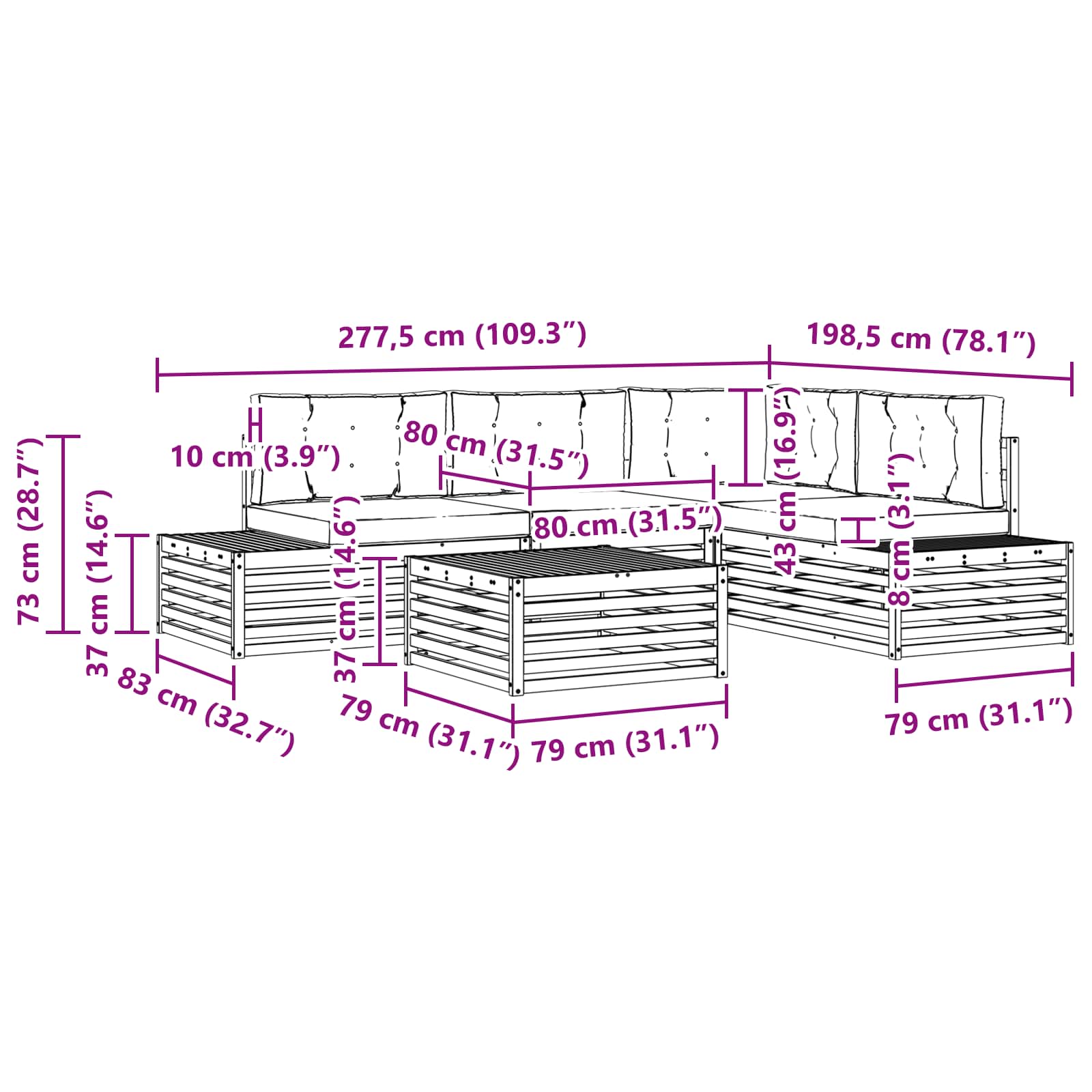 - 4 x Sedežna blazina: 80 x 80 x 8 cm (D x Š x V)