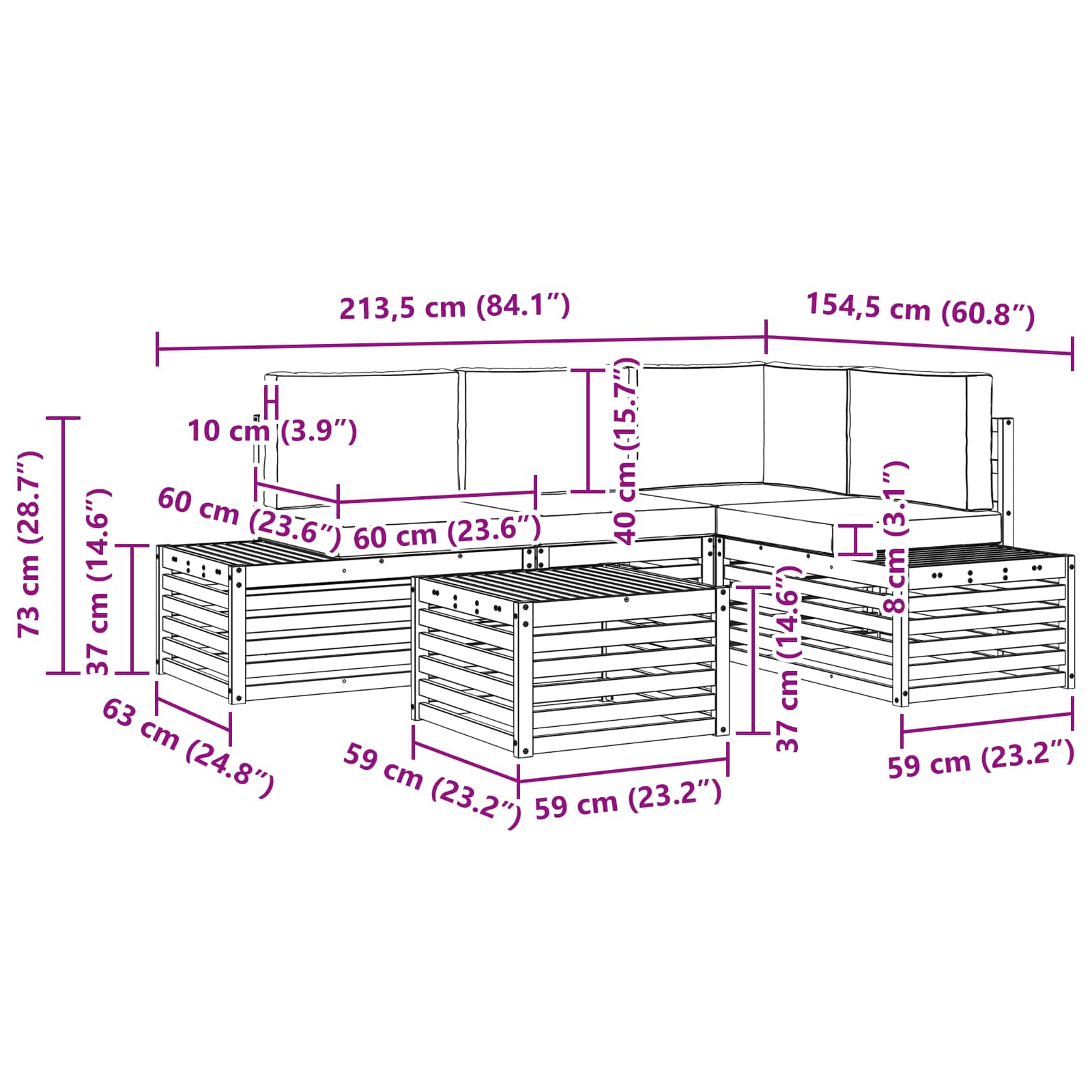 - 4 x Sedežne blazine: 60 x 60 x 8 cm (D x Š x V)