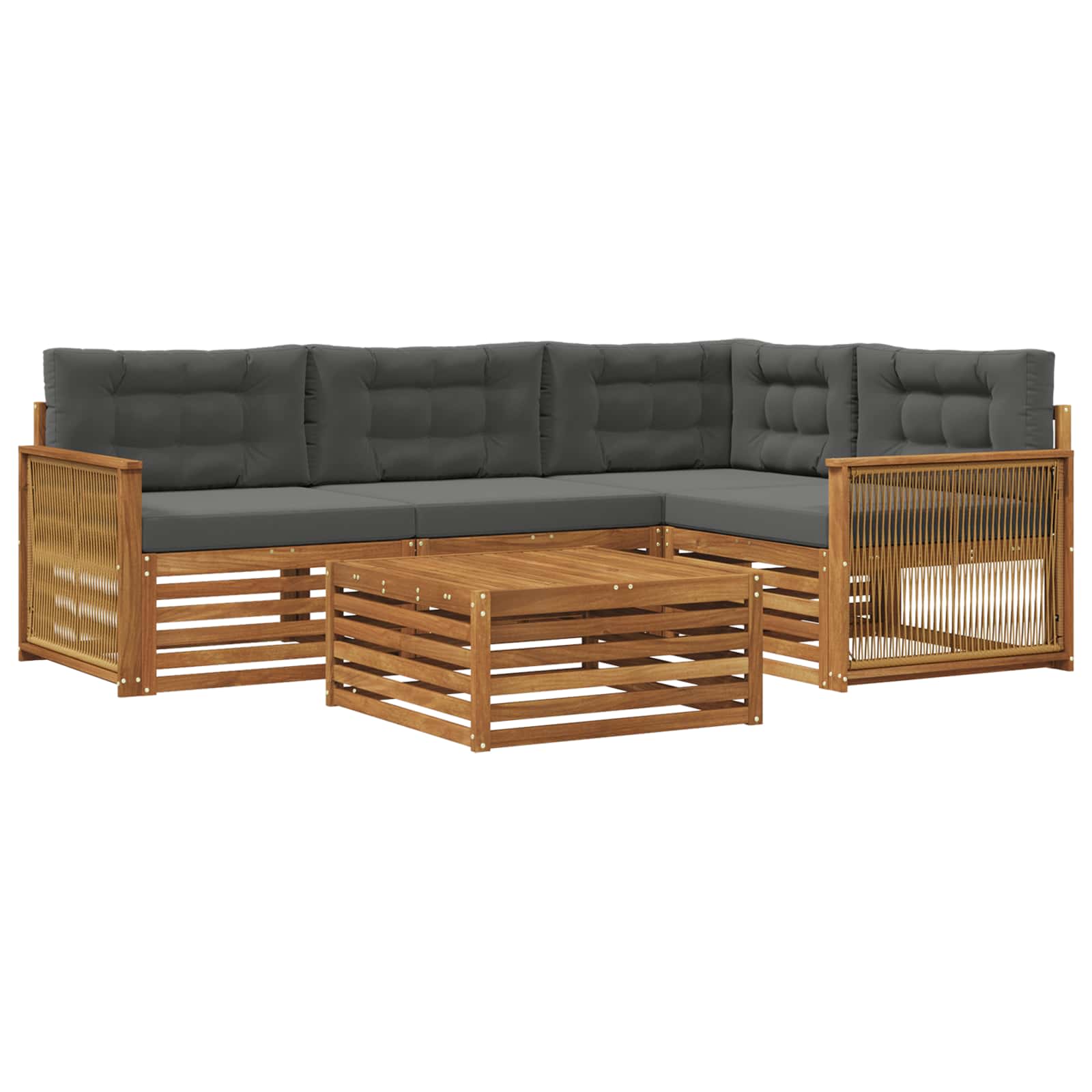 Komplet zunanjega pohištva združuje stil in funkcionalnost ter se lepo prilega vsakemu vrtu ali terasi. Njegova moderna zasnova s čistimi linijami in minimalno okrasjem dodaja eleganco ter omogoča sprostitev in druženje na prostem. Celega ga izdelajo iz trdnega akacijevega lesa, kar zagotavlja trpežnost in dolgotrajno privlačnost, kar je popolna izbira za tiste, ki iščejo praktično, a tudi lepo pohištvo za na prostem. Vzdržljiv trden akacijev les: Ta set je izdelan iz trdnega akacijevega lesa, poznanega po svoji trpežnosti in odpornosti na zunanje dejavnike. Stabilna konstrukcija nudi zanesljivo oporo in dolgotrajno stabilnost, naravna barva pa obogati vsak vrt ali teraso. Oblikovanje, odporno na vreme: Set ima lakirano površino, ki ponuja dodatno zaščito pred soncem in dežjem ter okoljskimi vplivi. Polirana obdelava ohranja privlačnost in funkcionalnost, kar zagotavlja dolgotrajno trpežnost za vaš vrt ali dvorišče. Komponente in zasnova: Vsak del, od naslonov do sedežnih površin, je zasnovan za estetiko in udobje. Opora nudi dodatno udobje ter ustvarja usklajen dizajn, primeren za razne zunanje dogodke. Udobje in vsestranskost: Modularna zasnova omogoča prilagodljive konfiguracije, ki ustrezajo vašim potrebam. Idealno za sprostitev, družabna srečanja ali mirno branje, ta set se zlahka prilagodi vsakemu zunanjemu okolju in maksimira udobje. Enostavna nega in vzdrževanje: Vzdrževanje pohištva je enostavno, dovolj je, da ga obrišite z vlažno krpo in se izogibate ostrim čistilom. Redna nega ohranja njegov videz in podaljšuje življenjsko dobo pohištva.