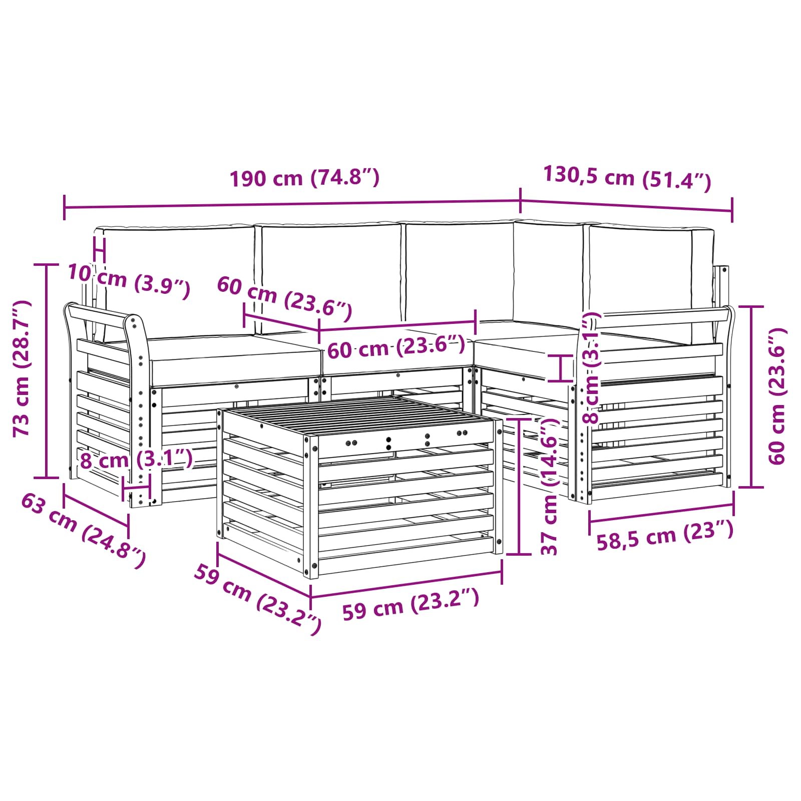 - 4 x Sedežna blazina: 60 x 60 x 8 cm (D x Š x V)