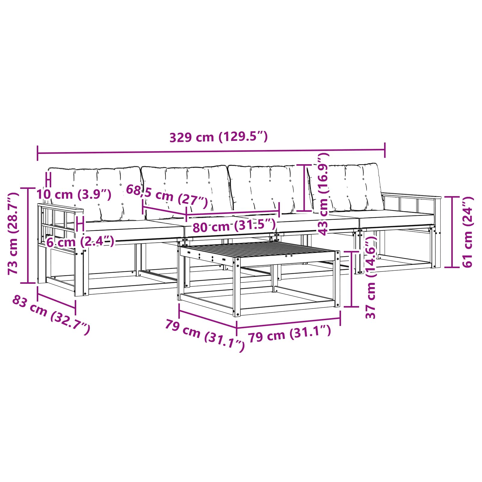 - 4 x Srednji kavč: 79 x 83 x 73 cm (D x Š x V)