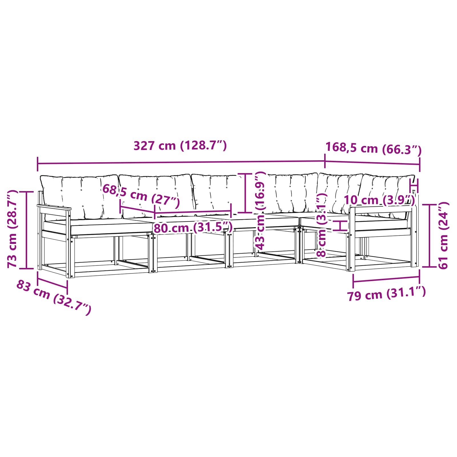 - 4 x srednji kavč: 79 x 83 x 73 cm (DxŠxV)