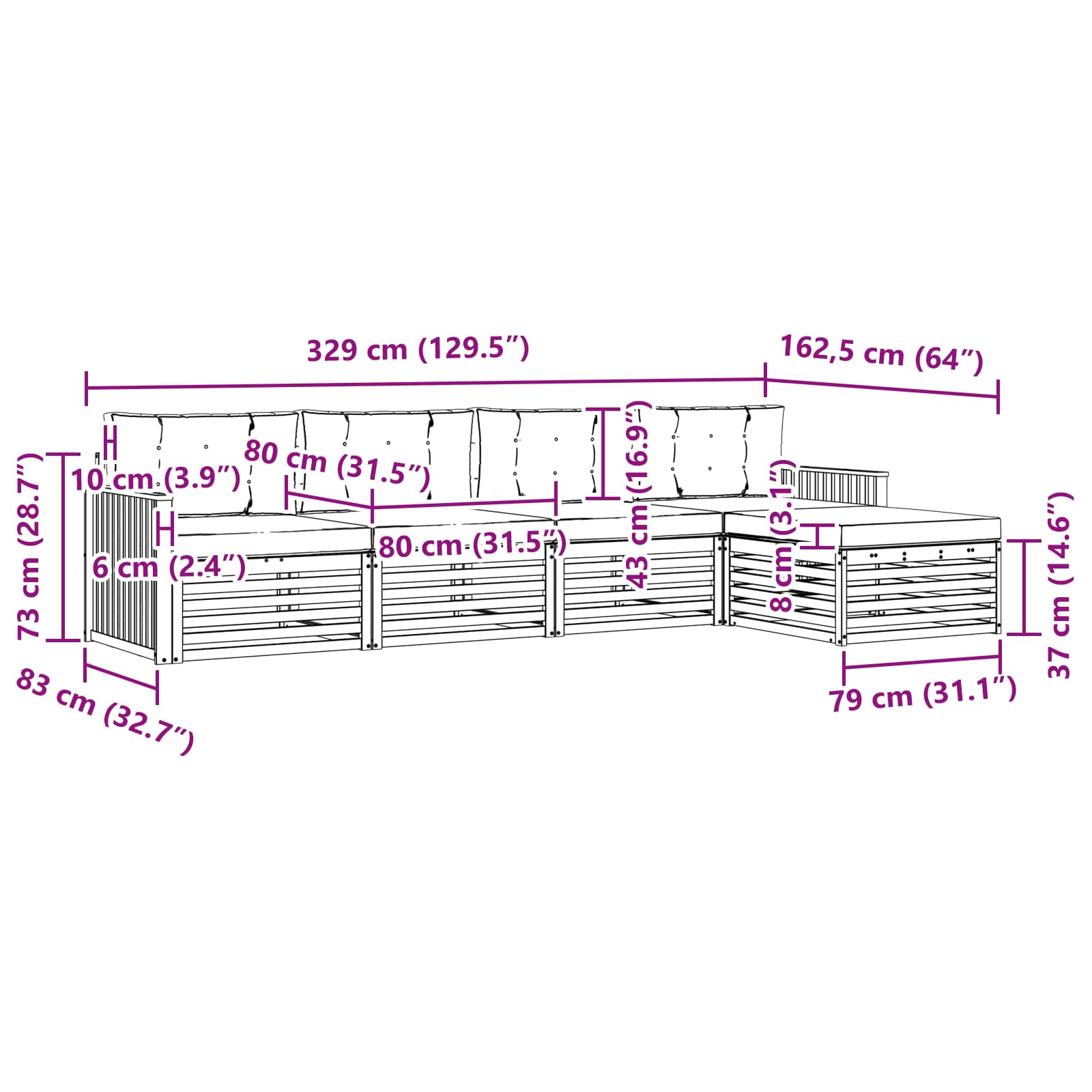 - 4 x srednja sofa: 79 x 83 x 73 cm (DxŠxV)