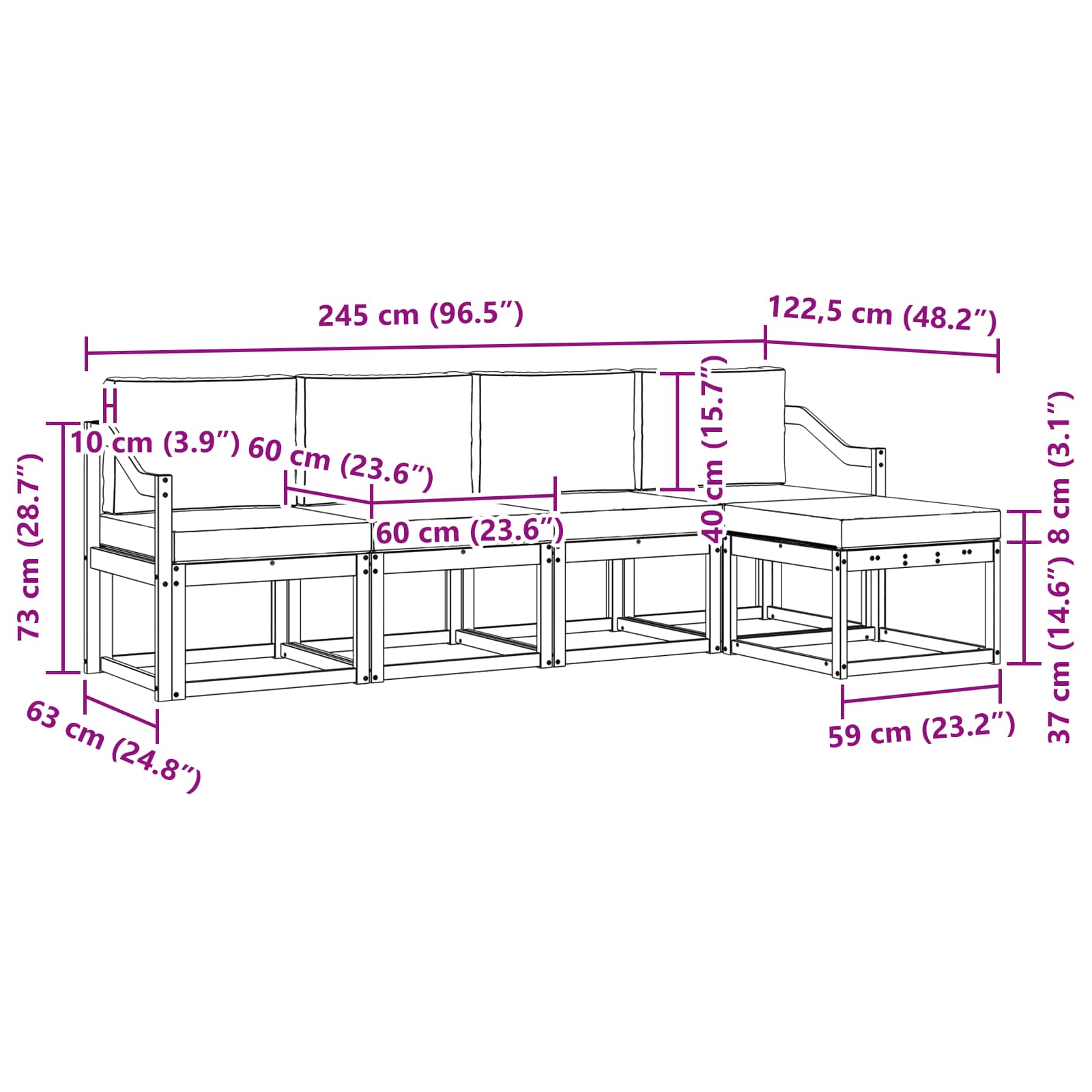 - 4 x Hrbtna blazina: 60 x 40 x 10 cm (D x Š x V)