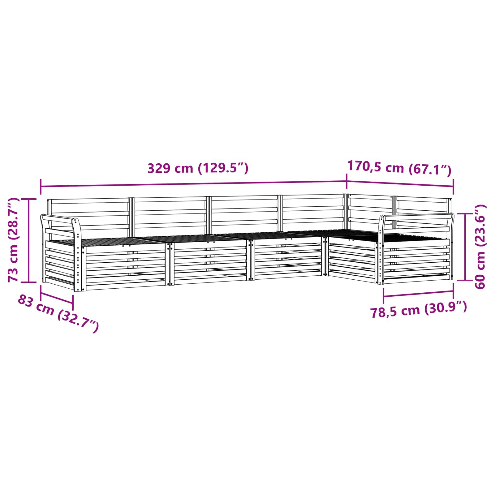 - Splošne dimenzije: 329 x 170,5 x 73 cm (D x Š x V)