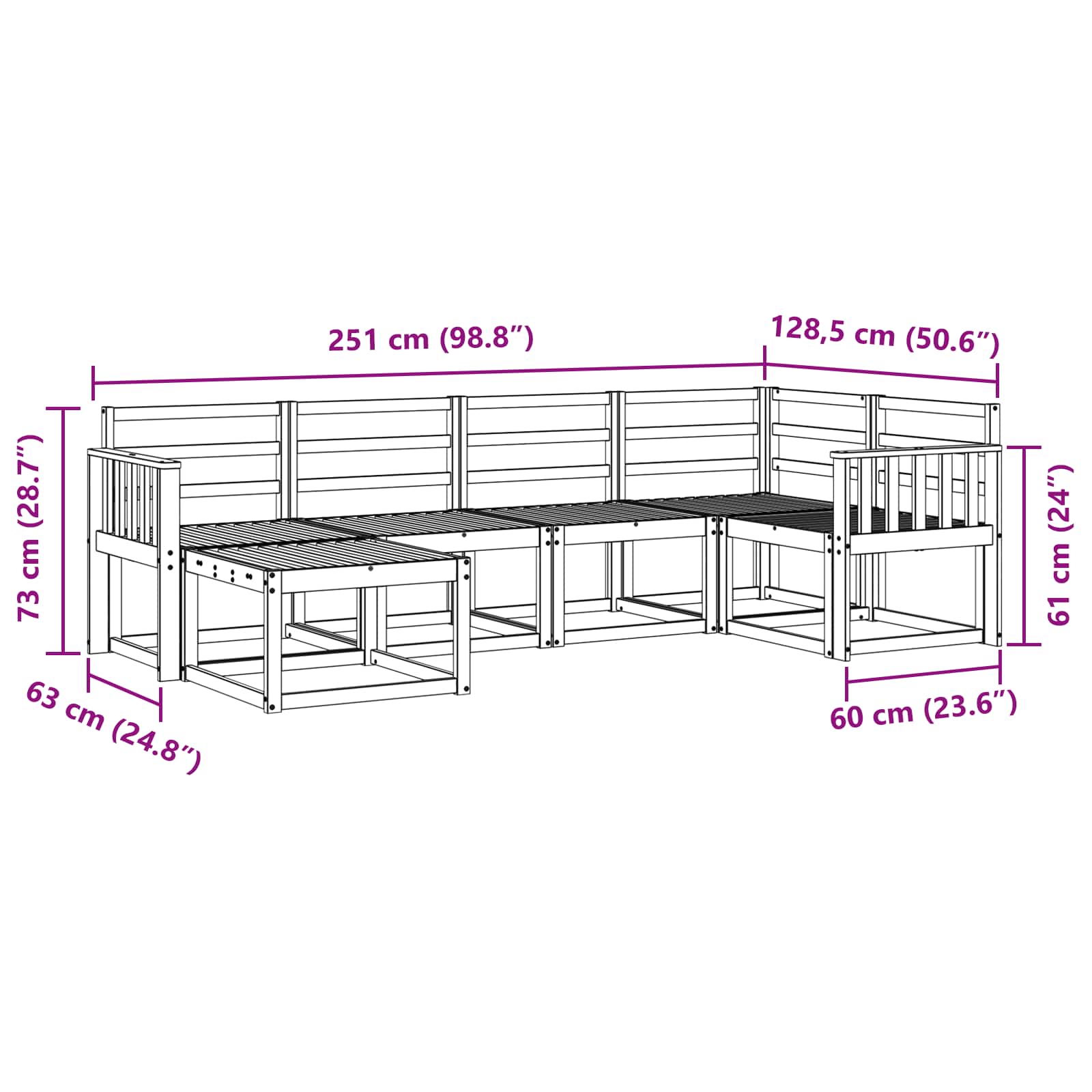 - 1 x Kotna sedežna garnitura: 63 x 63 x 73 cm (D x Š x V)