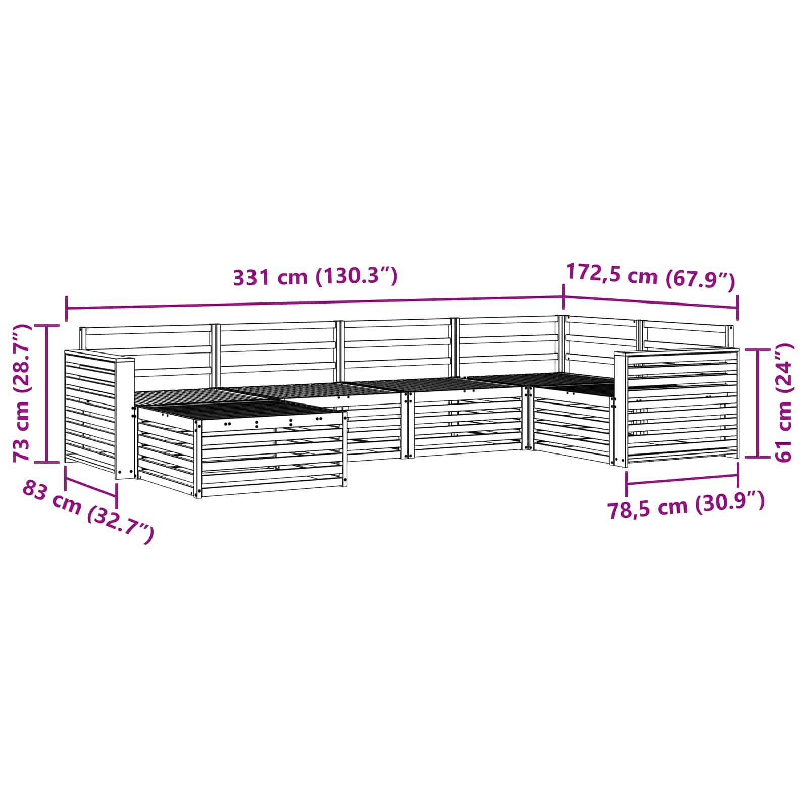 - Splošne dimenzije: 331 x 172,5 x 73 cm (D x Š x V)