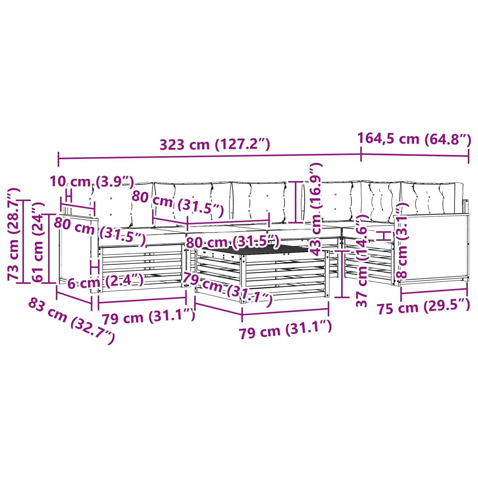 - 6 x Hrbtna blazina: 80 x 43 x 10 cm (D x Š x T)