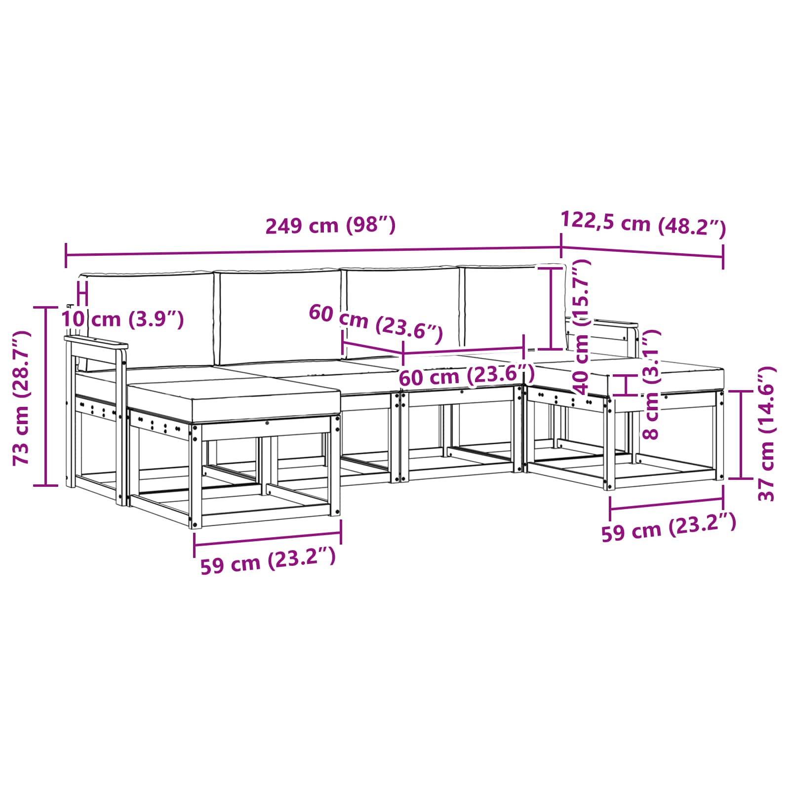 - 6 x Sedežna blazina: 60 x 60 x 8 cm (D x Š x V)