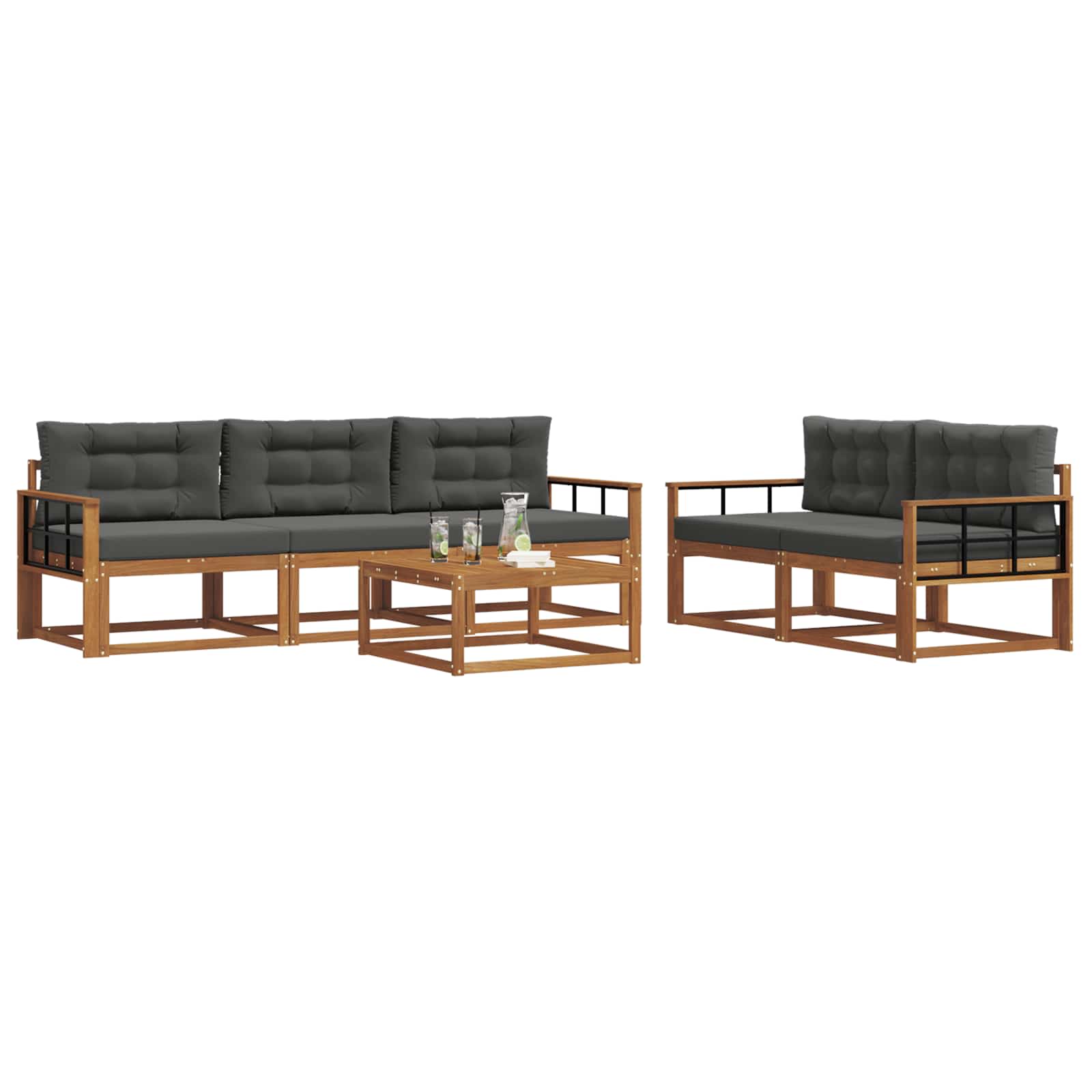 Ta eleganten set sofasetov je točno tisto, kar potrebujete za vaš vrt, teraso ali bazen. Moderno zasnovan, združuje stil in funkcionalnost, njegove tople rjave barve in letvasta hrbtišča prinašajo pridih luksuza, ter ustvarjajo udoben prostor za druženje ali sproščanje. Ne glede na to, ali ste pod streho ali na soncu, ta set prinaša brezčasen šarm in prilagodljivost, kar vabi vse, da uživajo v zunanjih trenutkih. Trden akacijev les: Ta sofaset je narejen iz vrhunskega trdega akacijevega lesa, kar zagotavlja naravno lepoto in trpežnost. Akacija je znana po svoji odpornosti na vreme in obrabo, kar podaljšuje življenjsko dobo pohištva. Lesena struktura je enostavna za vzdrževanje in idealna za moderne uporabnike. Letvasta zasnova: Z elegantno letvasto zasnovo, ta sofaset prinaša funkcionalnost in zračnost. Ergonomična podpora za hrbet nudi udobje, estetska zasnova pa izboljšuje zunanje površine, kar ustvarja prijetna mesta za druženje ali sprostitev. Fiksni letvičasti okvir: Z močno, fiksno zasnovo okvirja, ta sofaset zagotavlja stabilnost in zanesljivost. Idealna izbira za zunanje prostore, konstrukcija pa doda estetsko vrednost, ki poudarja tako trpežnost kot šik izgled. Lastnost odporna na vreme: Zasnovan za zunanjo uporabo, ta set je odporen na različne vremenske pogoje. Od sončnega vremena do vetrovnih večerov, materiali in zasnova zaščitijo pohištvo, da ostane udobno skozi vse leto. Modularna konfiguracija: Ta sofaset vam omogoča, da prilagodite svoje sedežne postavitve, kar je super za različne priložnosti. Ustvarite intime skupine ali širša ležišča, kar se enostavno prilagaja vašim potrebam. Njegova vsestranskost povečuje uporabnost in omogoča prilagoditev prostora po želji.